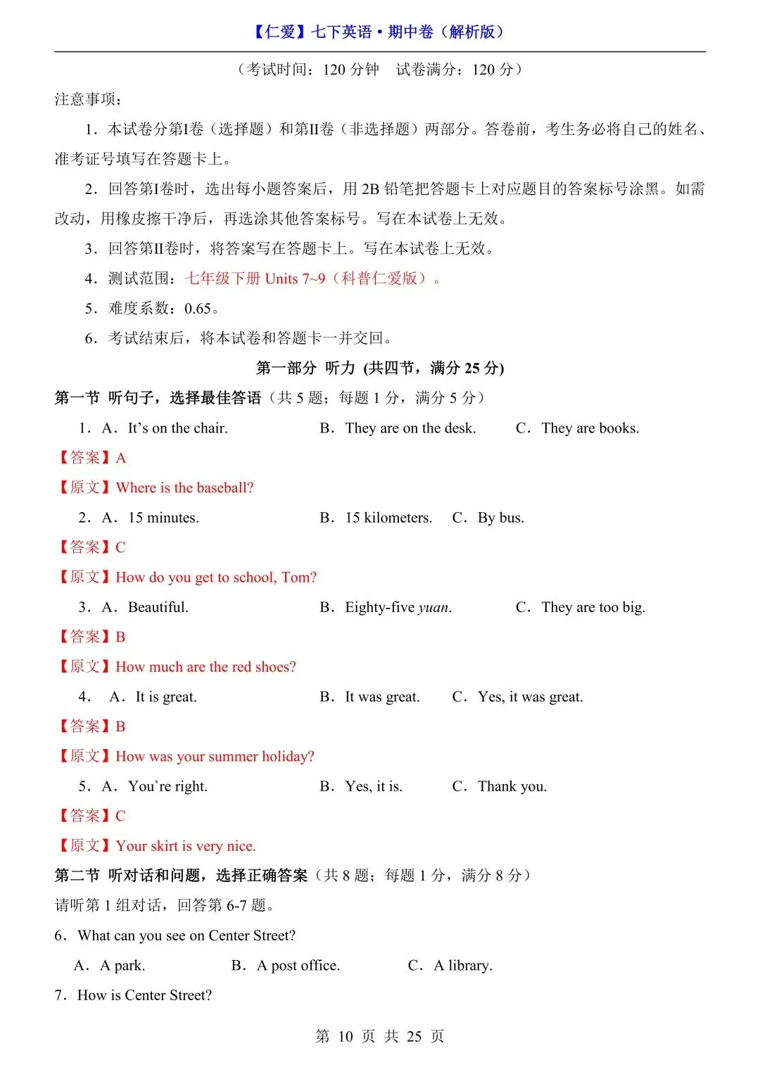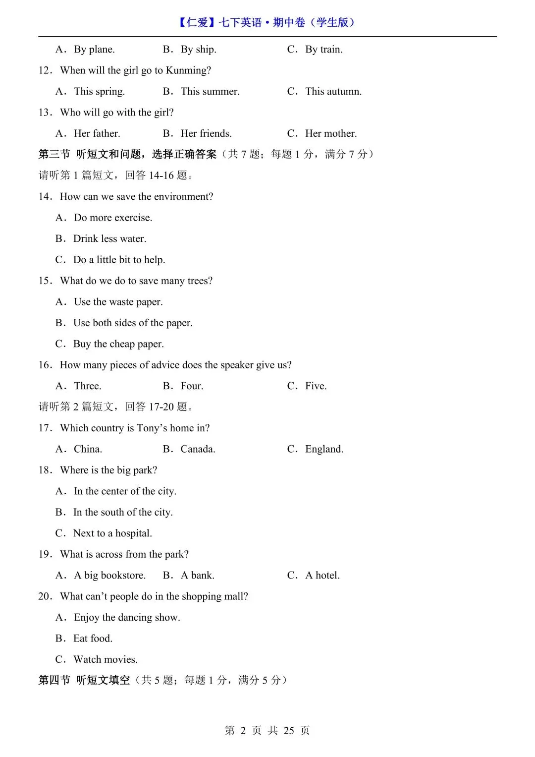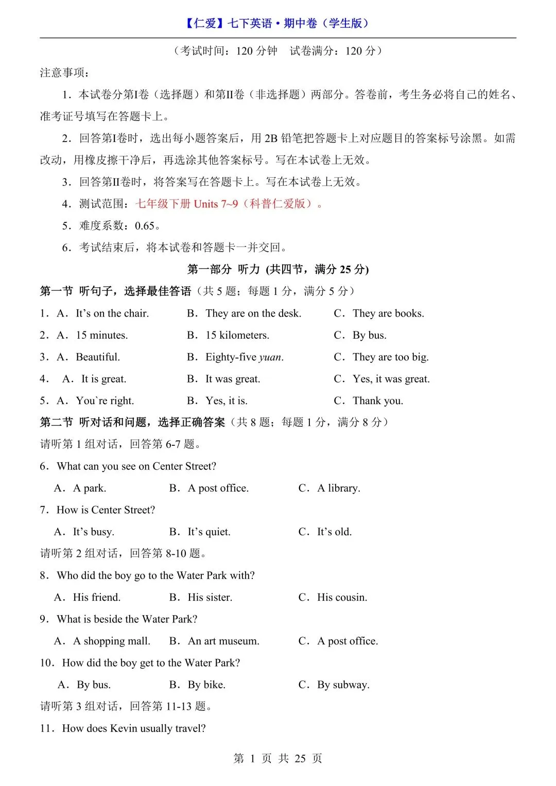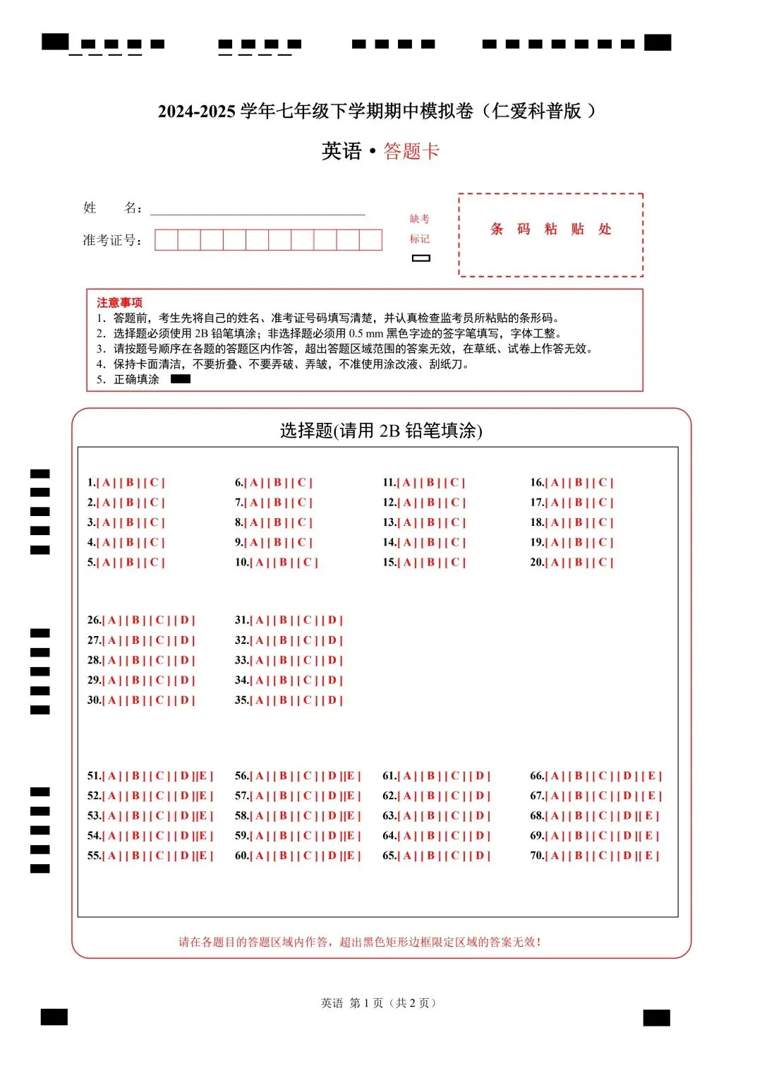 26年春七年级初一下册仁爱版英语期中模拟测试卷【附答案+答题卡】丨高清电子版可打印(415)