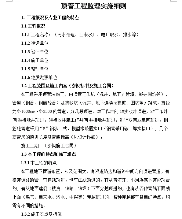 本工程地下管道布置,涉及范围大,有沿道路边和道路中间方向顶进管道,有横穿道路顶管,有直线顶进,也有曲线顶进的,有从黄浦江、小河浜底下穿越顶管的,有从地面建筑(楼房、铁路、铁塔)下面穿越顶进的,也有从各种管线下面或上面(煤气、自来水、污水、电缆等)穿越顶进的,各种穿越都有各自的特点,均需有不同的措施。