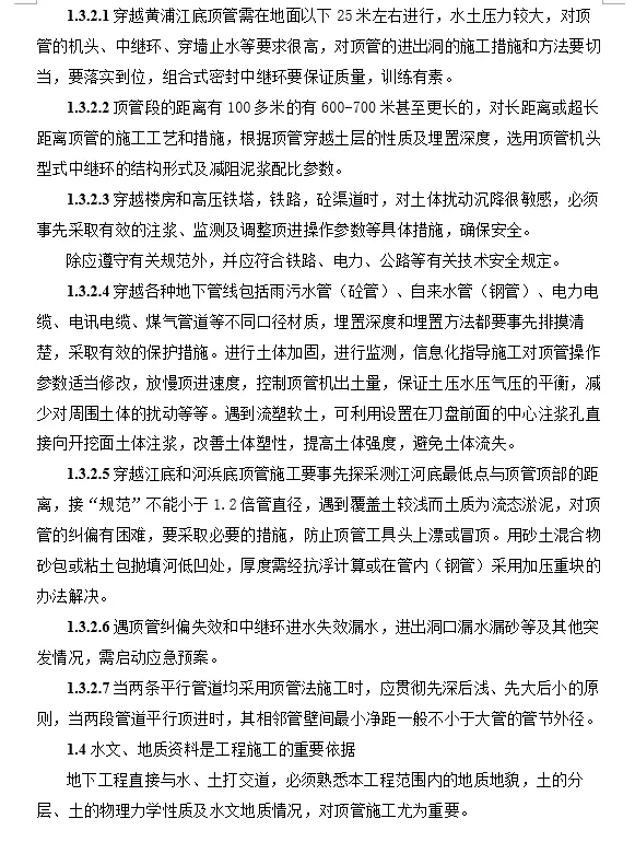 1.3.2.2顶管段的距离有100多米的有600-700米甚至更长的,对长距离或超长距离顶管的施工工艺和措施,根据顶管穿越土层的性质及埋置深度,选用顶管机头型式中继环的结构形式及减阻泥浆配比参数。