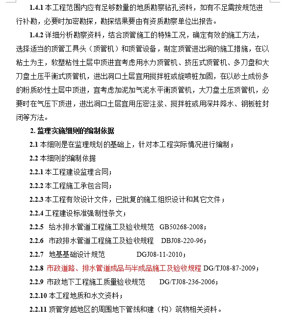 1.3.2.7当两条平行管道均采用顶管法施工时,应贯彻先深后浅、先大后小的原则,当两段管道平行顶进时,其相邻管壁间最小净距一般不小于大管的管节外径。