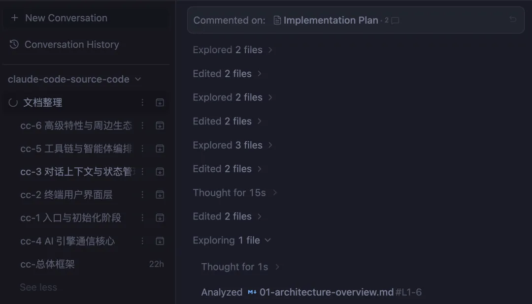 我按上面的建议拆了 5 个 agent,每个 agent 负责阅读一部分。 我在 Agent Manager 里,Claude Code 源码对应的 workspace 下创建了 5 个 New Conversation,再把总结构里分出来的 5 个层次描述分别复制给它们。