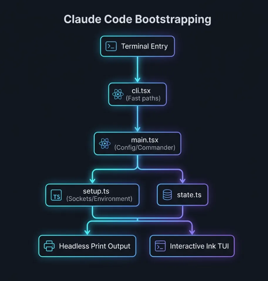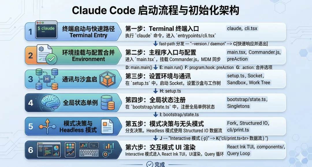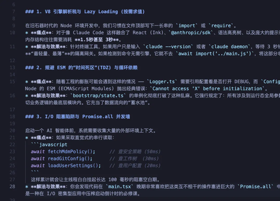 如果我们想知道 Claude Code 在执行命令时到底发生了什么,就可以让 agent 去分析第一部分,也就是“终端启动与快速路径”。 比如一些简单的参数,像 --version,本身可以直接输出结果,那就没必要把整套主代码都导入进来。 这种设计其实就是一种懒启动,用来规避主代码的加载。