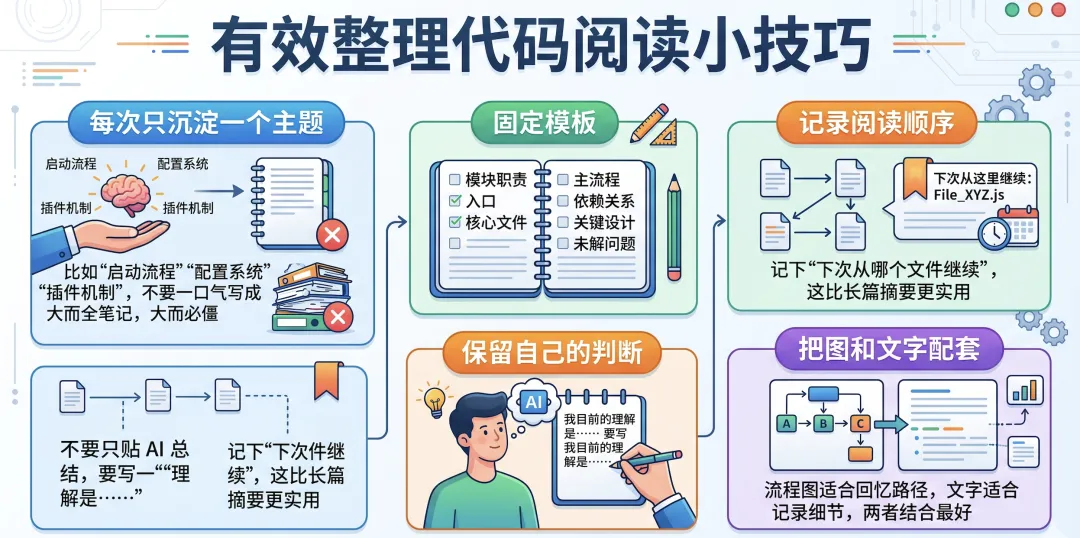 • 一次最好只整理一个主题,比如“启动流程”“配置系统”“插件机制”这种。不要一上来就想写成一篇大而全的总笔记,最后往往什么都沾一点,但不够深。 -