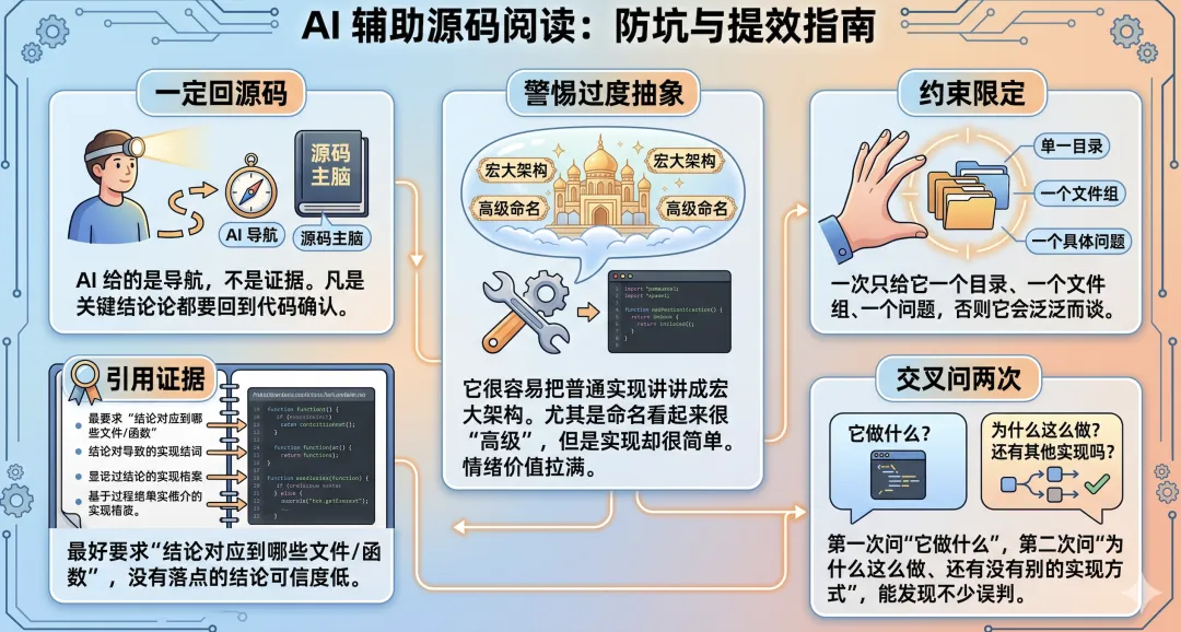 • 一定回源码:AI 给你的是导航,不是证据。 凡是关键结论,都要回到代码里确认。 -