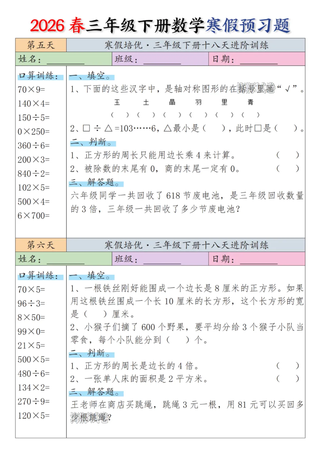 2026春三年级(下)数学寒假预习题 电子版可打印