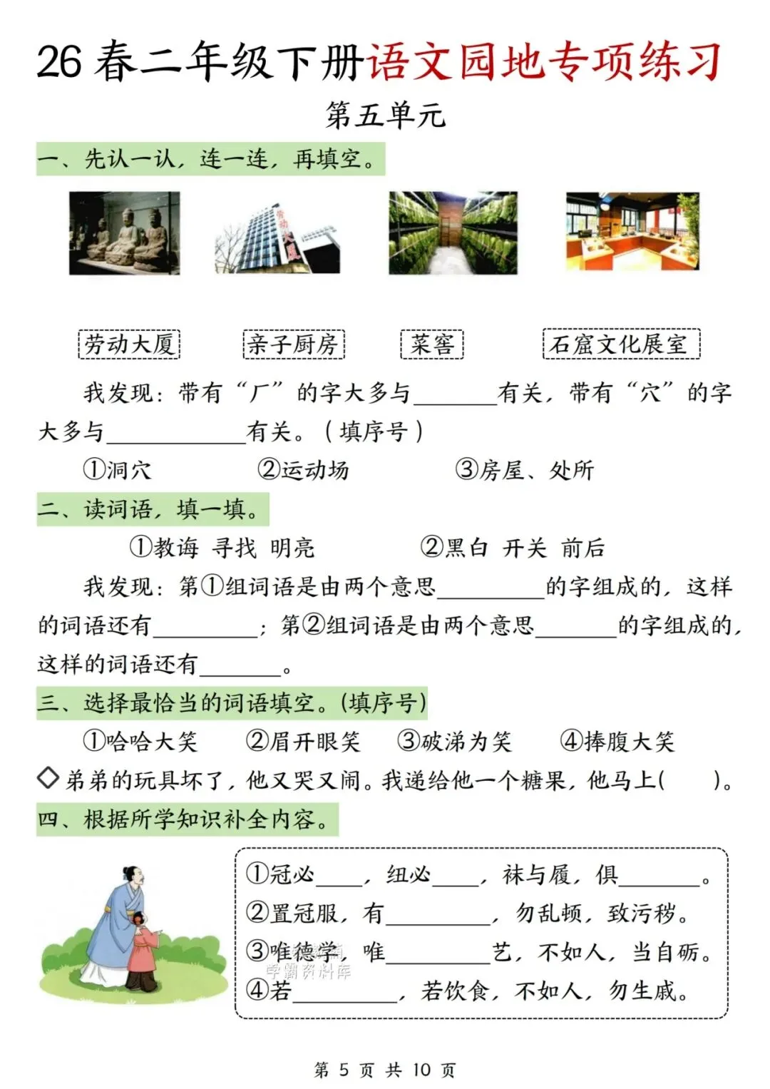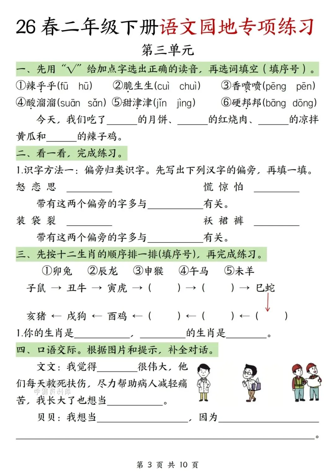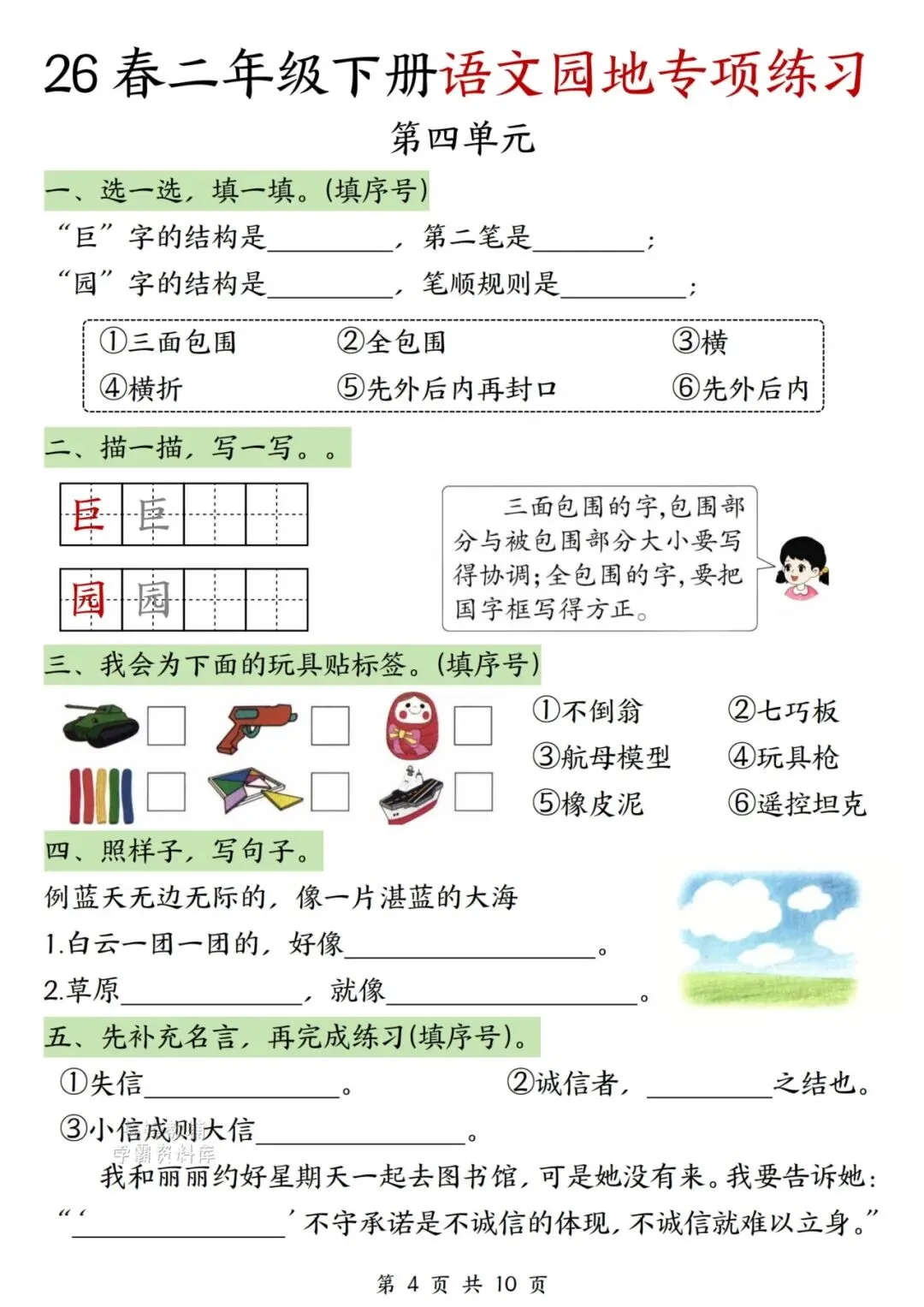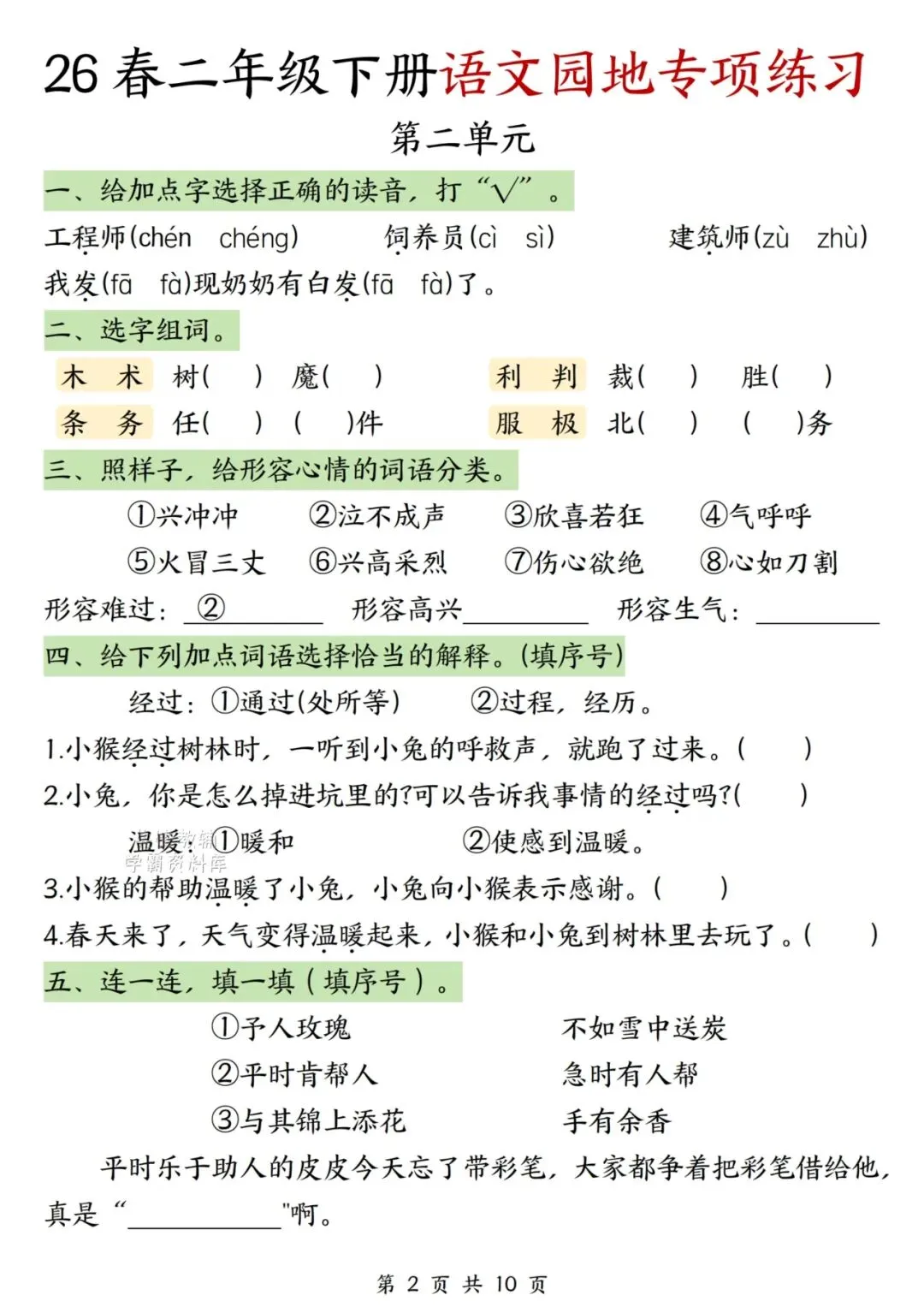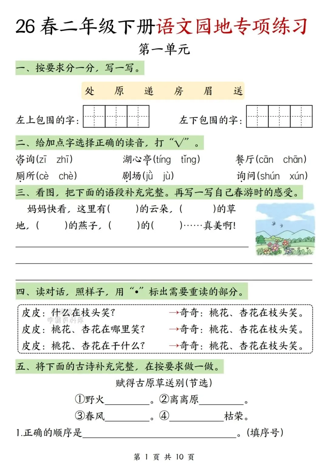 📚🔥26年新版二年级语文下册语文1-8单元园地专项训练电子版可打印。二年级下册语文学习的“关键爬坡期”已到,语文园地作为单元知识的“浓缩精华包”,藏着字词辨析、句式运用、古诗积累等核心考点。为帮孩子系统复习、扫清知识盲区,我们精心整理了1 – 8单元语文园地专项练习,覆盖全册重点,助力孩子稳步提升语文能力!