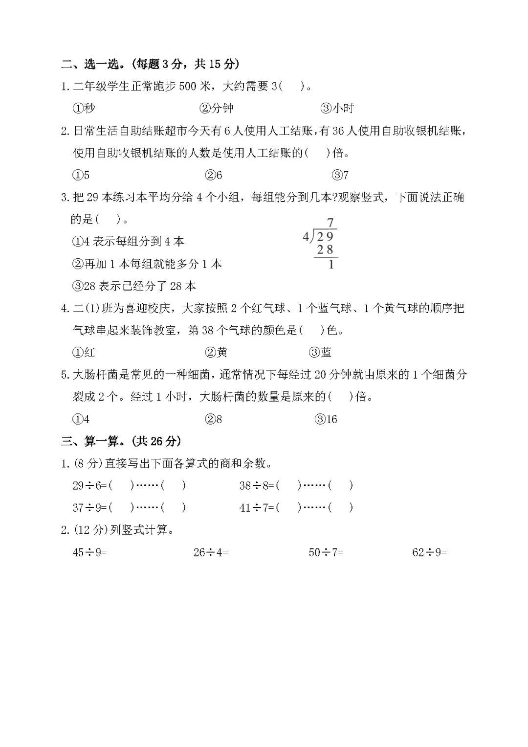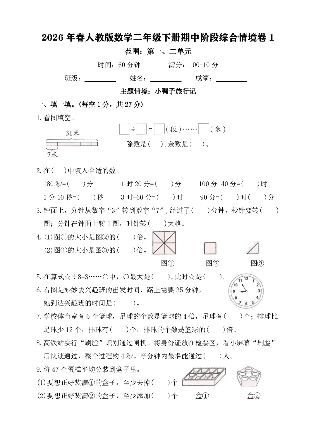 26春人教版数学二年级下册《期中试卷》丨可下载打印