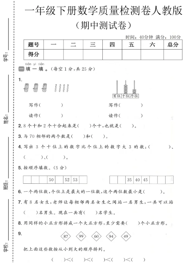 一年级下册人教版数学《期中检测卷》多套,电子版可打印