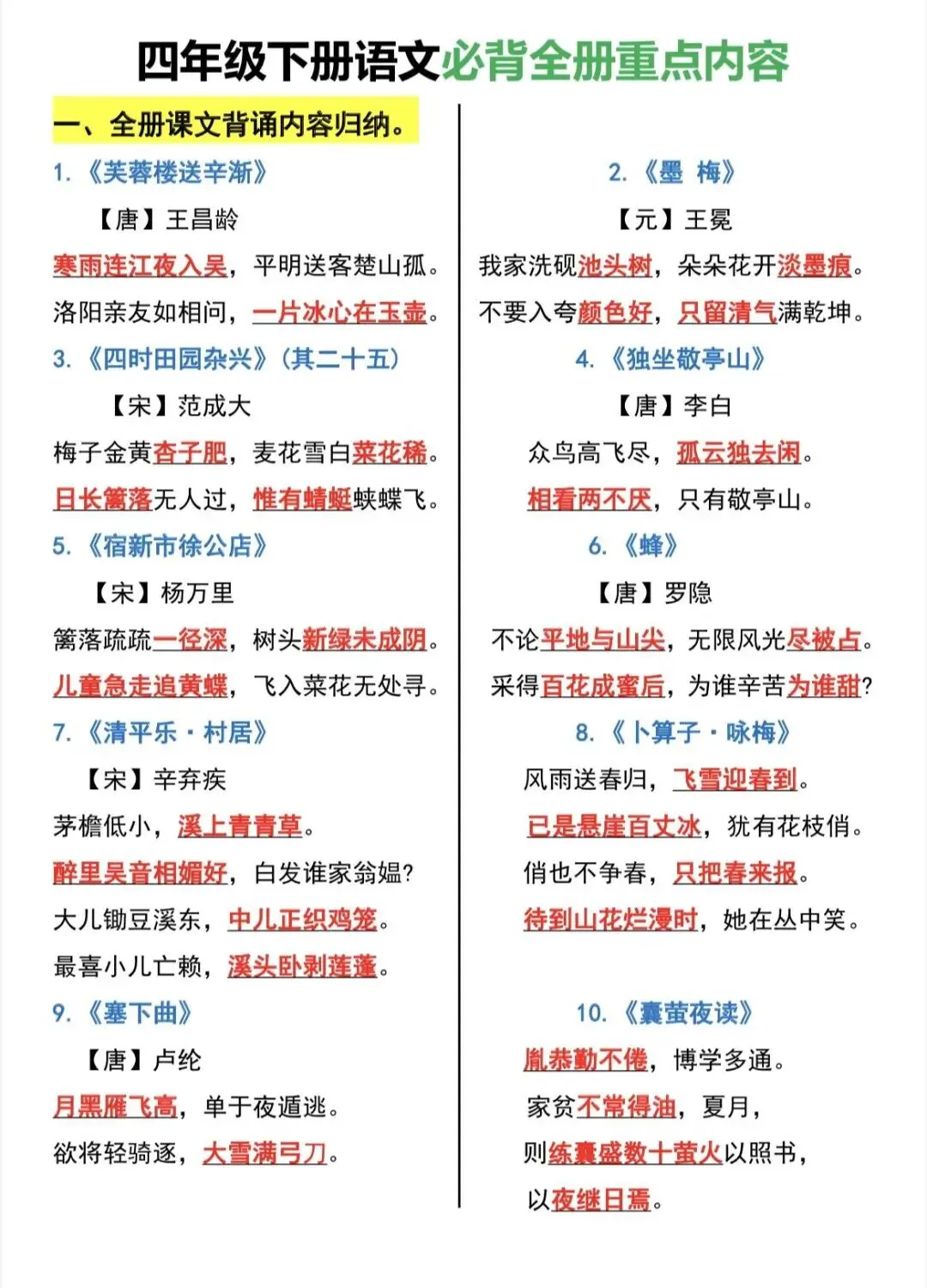 2026春新版四年级下册人教部编版语文《全册重点必背内容汇总》 可打印 今天晴天妈妈爱学习;给大家分享:2026春新版四年级下册人教部编版语文《全册重点必背内容汇总》 电子版可打印每天持续分享更多的优质学习资料。 以下为部分截图,具体看完整PDF文件 (温馨提示:文末有电子版领取方式) 完整电子版: ①:在公众号对话框中回复:3773 (不是在“留言”中发数字)