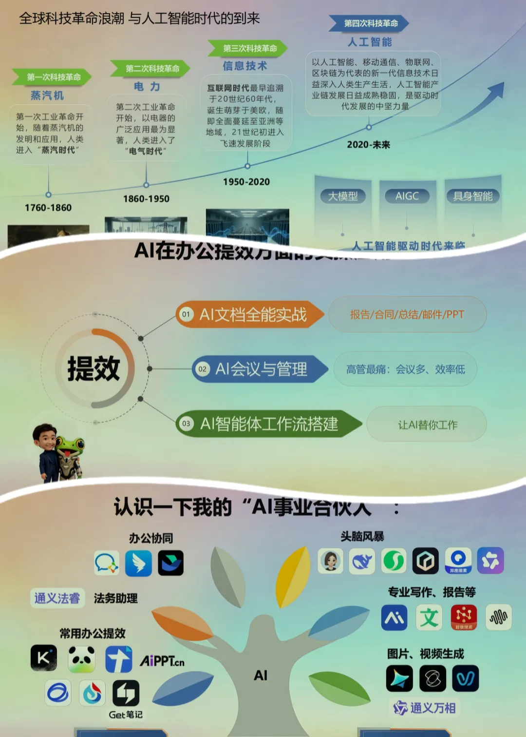本次活动邀请了AI应用领域的资深专家作为讲师,从历次科技革命讲到当下AI技术能做什么,从AI应用投射企业的刚需讲到AI对办公效率的提升、AI会议与管理以及AI智能体工作流搭建,从AI的应用方向讲到实现AI应用的具体软件,最后针对一些具体软件的操作进行了讲解。让大家对AI的宏观和微观都有了一定的认识。