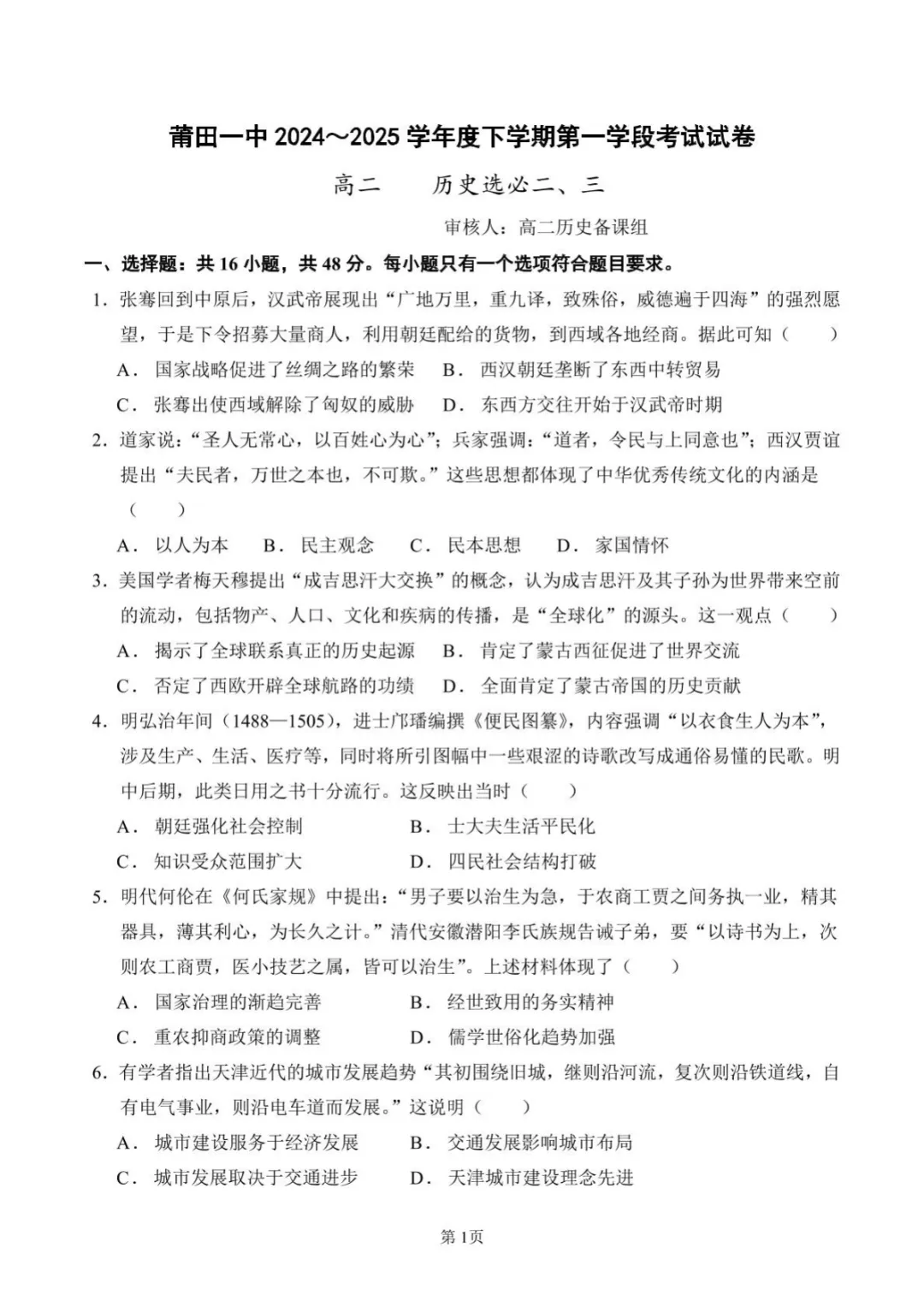 【可下载】福建省莆田第一中学2024-2025学年高二下学期期中考试历史试题(图片版,含答案)