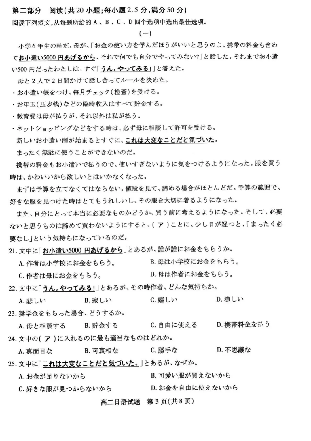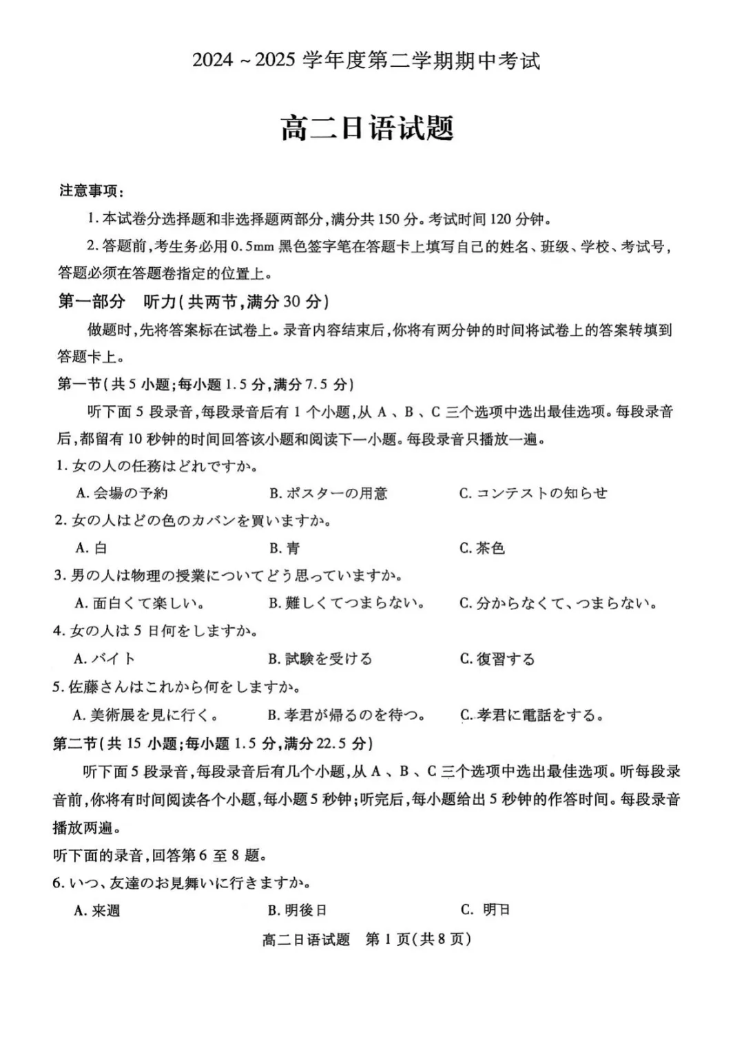 【可下载】江苏省徐州市2024-2025学年高二下学期期中考试日语试卷(图片版,含音频)
