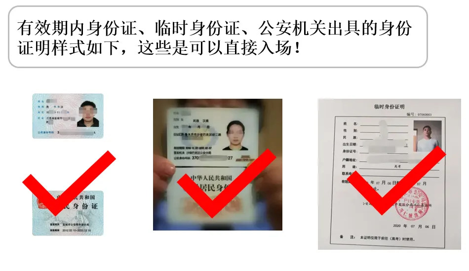 考生进场将核实纸质准考证、有效身份证件,考试开考30分钟后,迟到考生不得进场。入场考试有效身份证件包括: