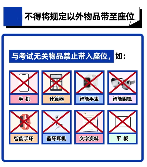 3.考点入口附近考试当天可能拥堵,有的步行至考场路程较长。考生应综合考虑天气、道路等状况,提前做好规划、预留足额时间到达,谨防迟到影响考试。