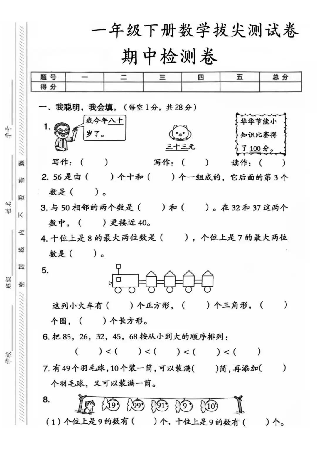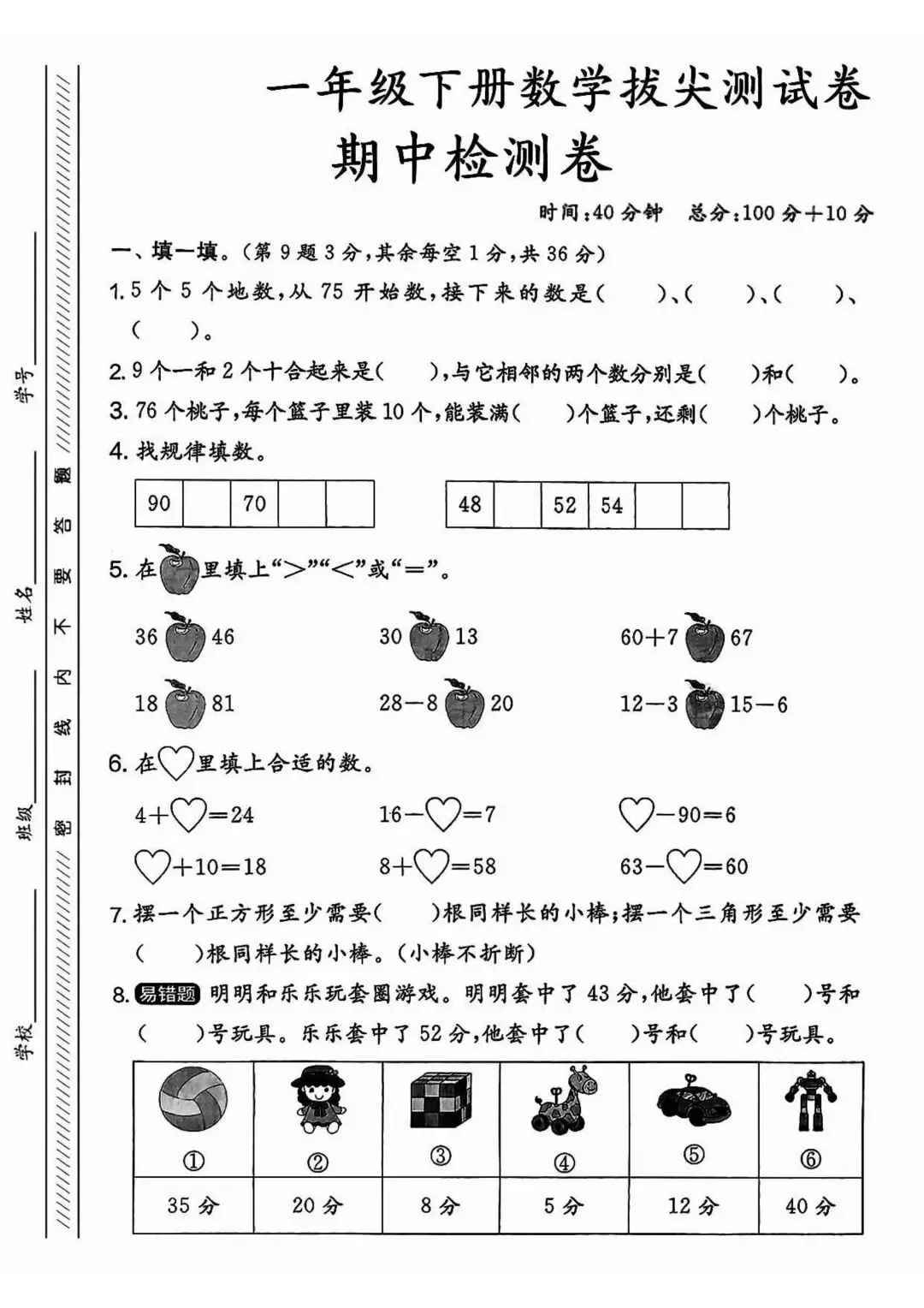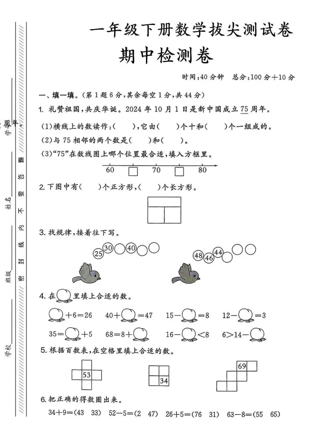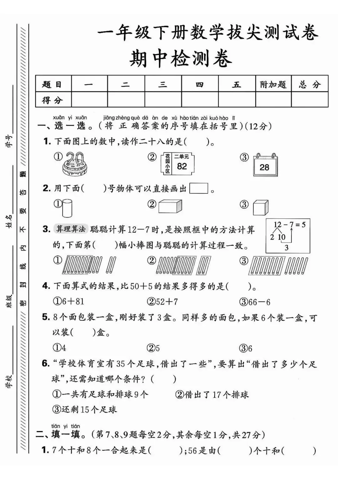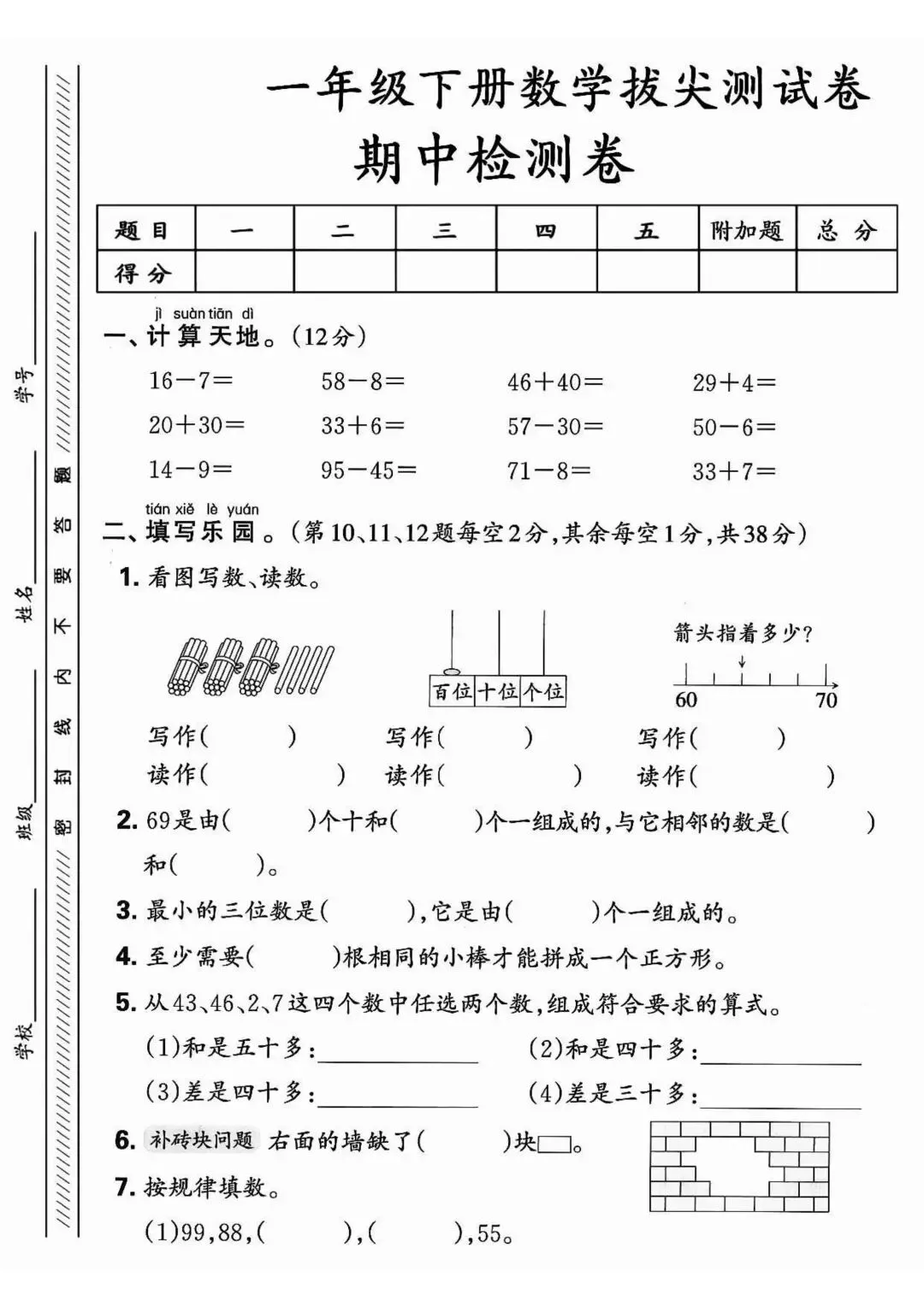 一年级下册数学期中测试卷可打印|5 套期中押题卷,考前冲刺全覆盖