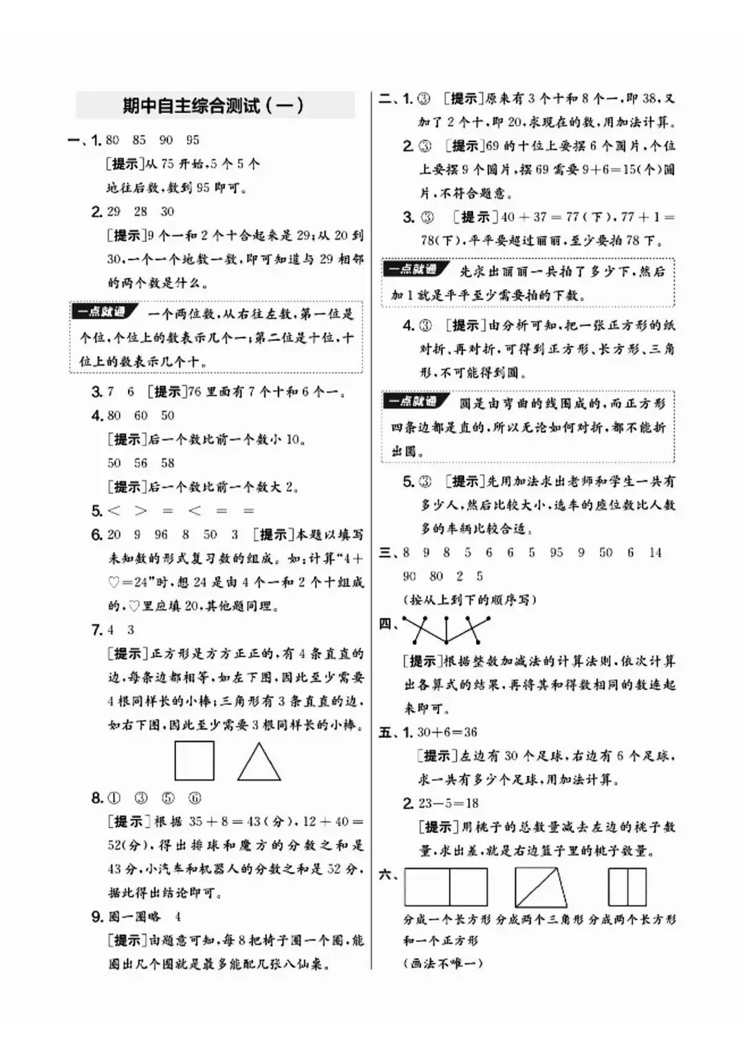 该资料增加数的组成、找规律、平面图形拼组等内容,加入少量看图列式和简单应用题,难度适中,适合查漏补缺、巩固薄弱点。