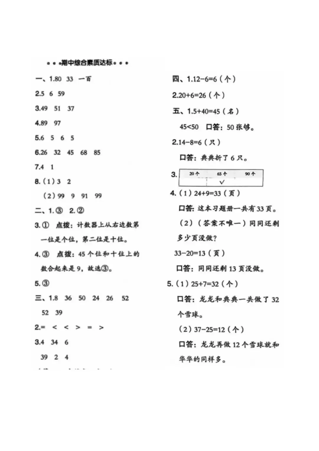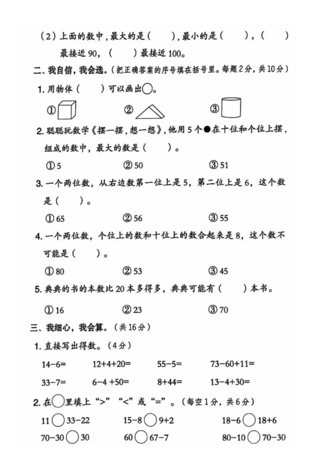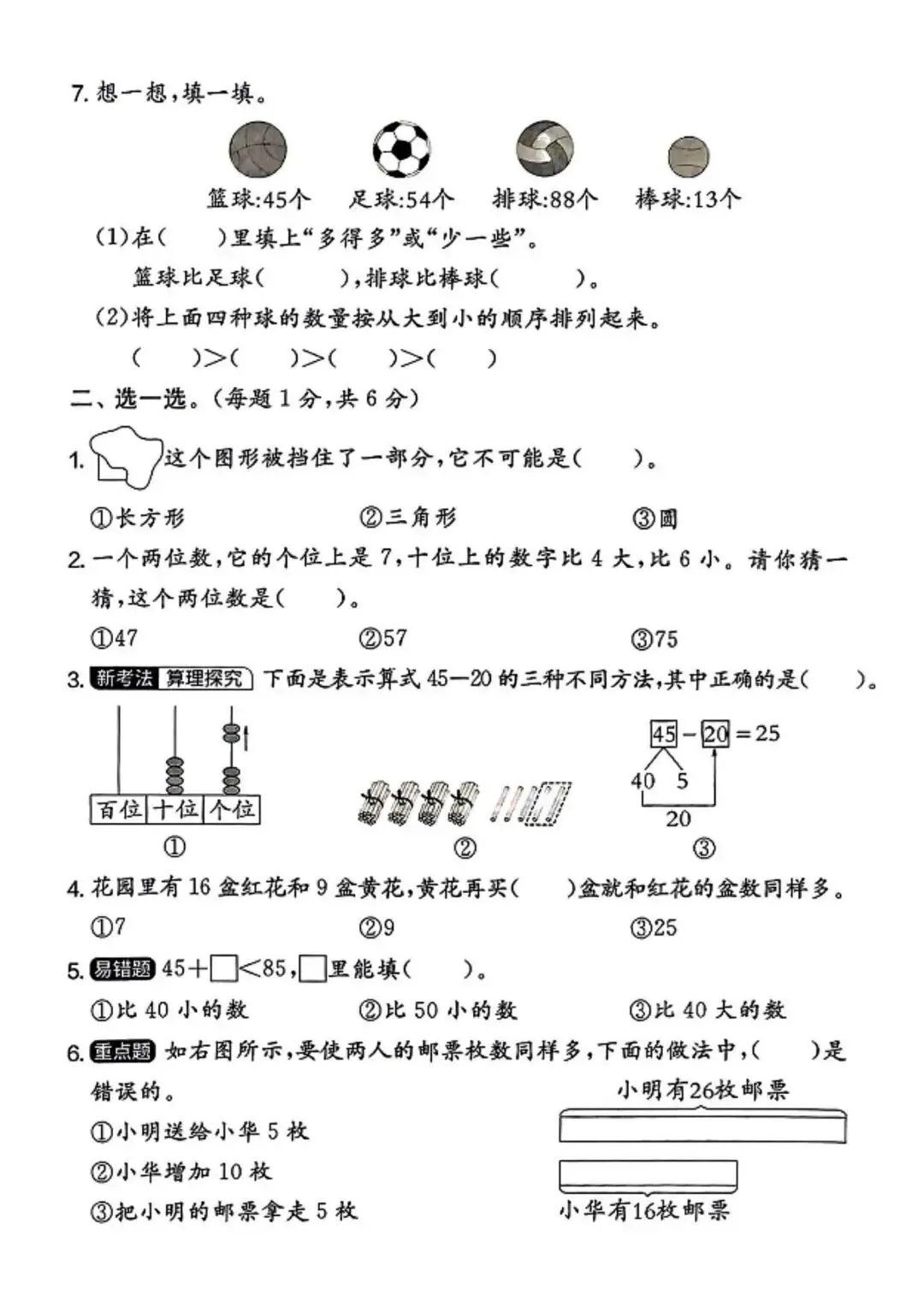 该资料以口算、数的认识、简单图形为主,侧重 20 以内退位减法、100 以内数的读写与大小比较,题型简单,适合孩子快速熟悉期中基础考点,夯实计算基本功。
