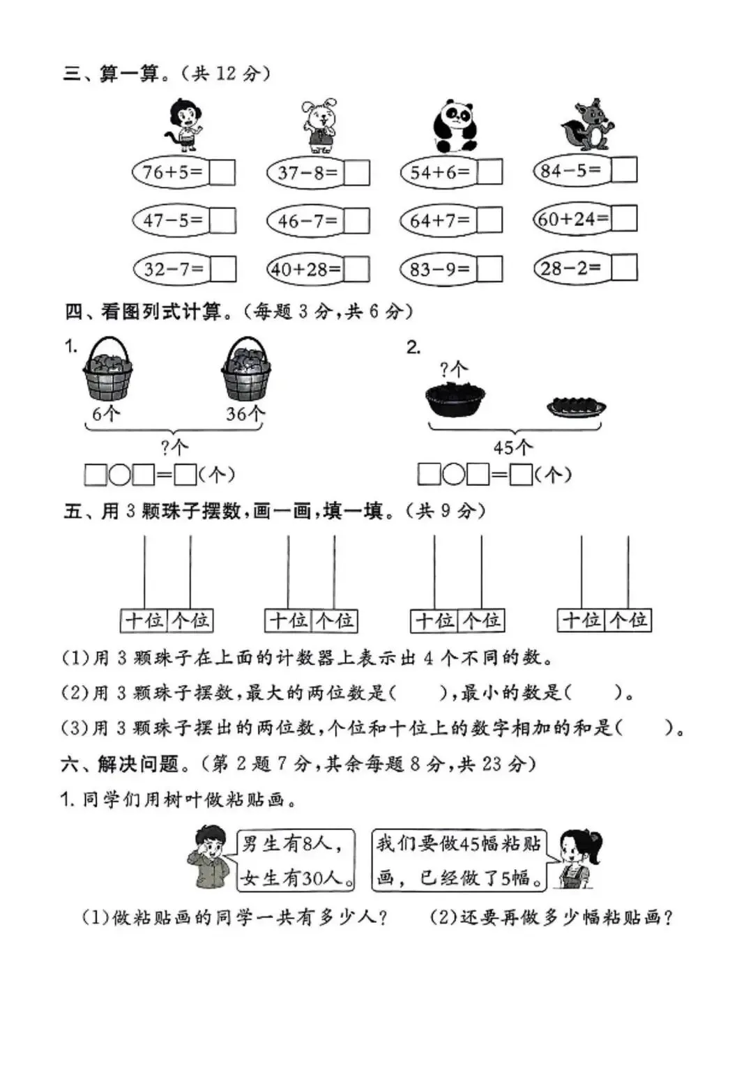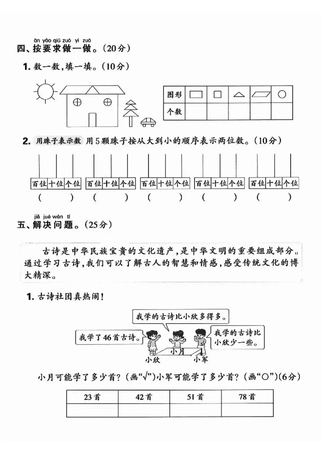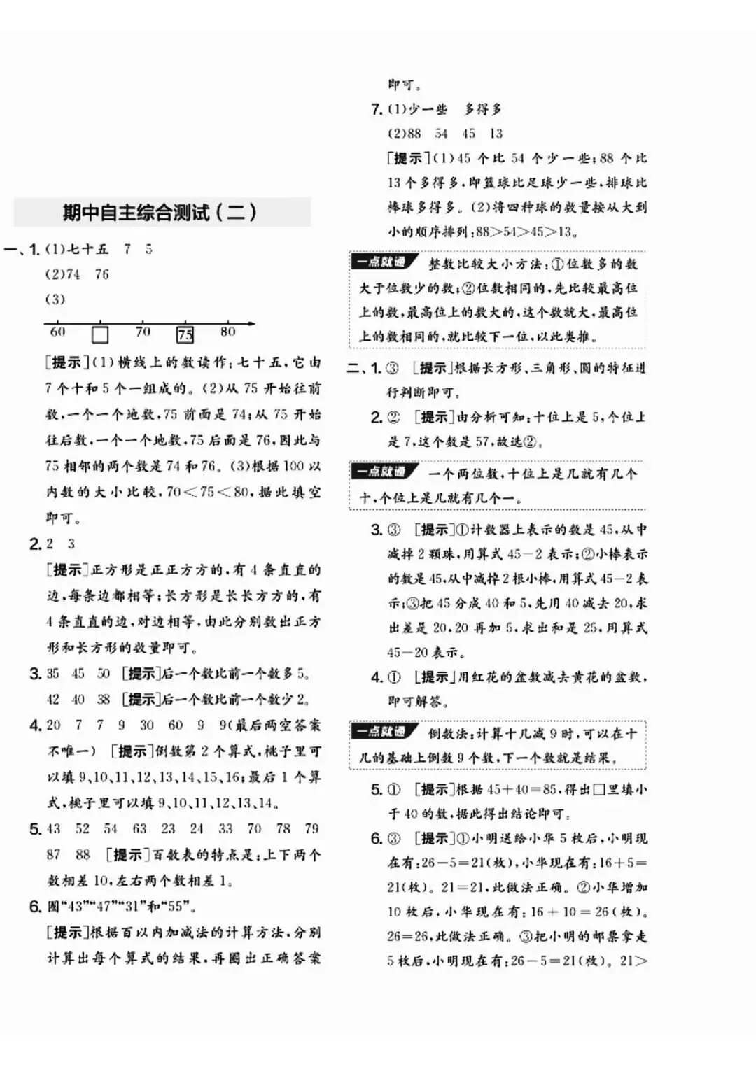 该资料以口算、数的认识、简单图形为主,侧重 20 以内退位减法、100 以内数的读写与大小比较,题型简单,适合孩子快速熟悉期中基础考点,夯实计算基本功。