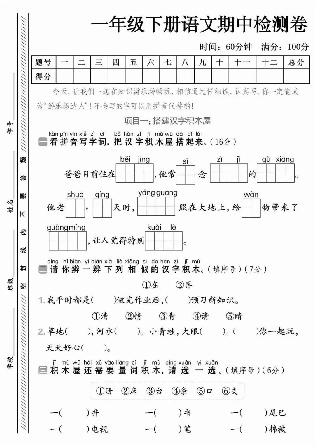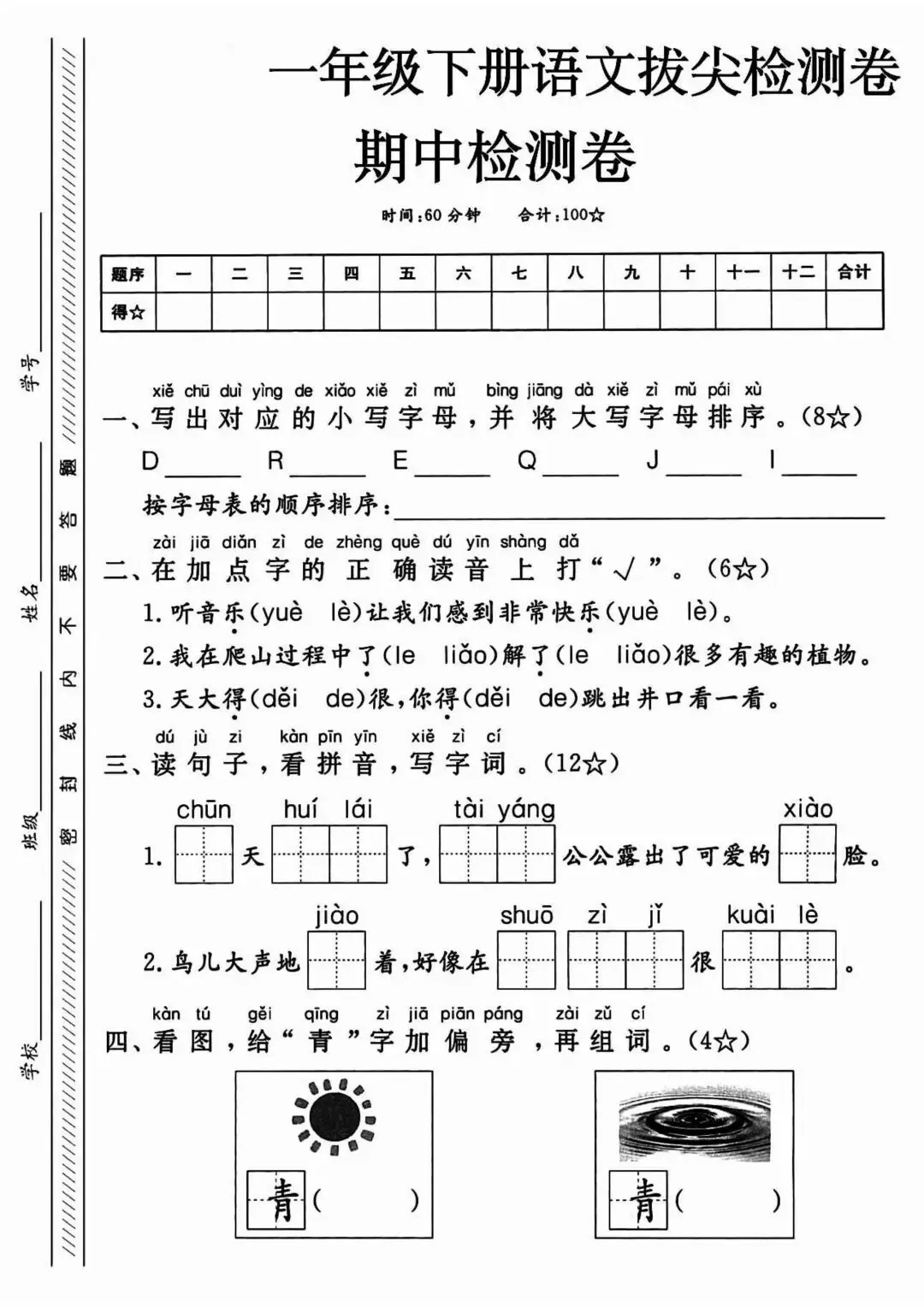 全面覆盖拼音、字词、句子、阅读、看图写话,包含课内阅读、简单课外阅读,考查课文理解、信息提取、句子运用,题型与真实考试一致,适合期中模拟、熟悉考试题型。