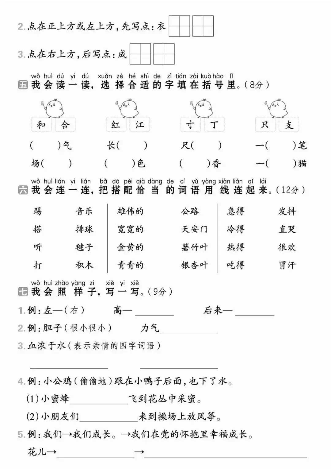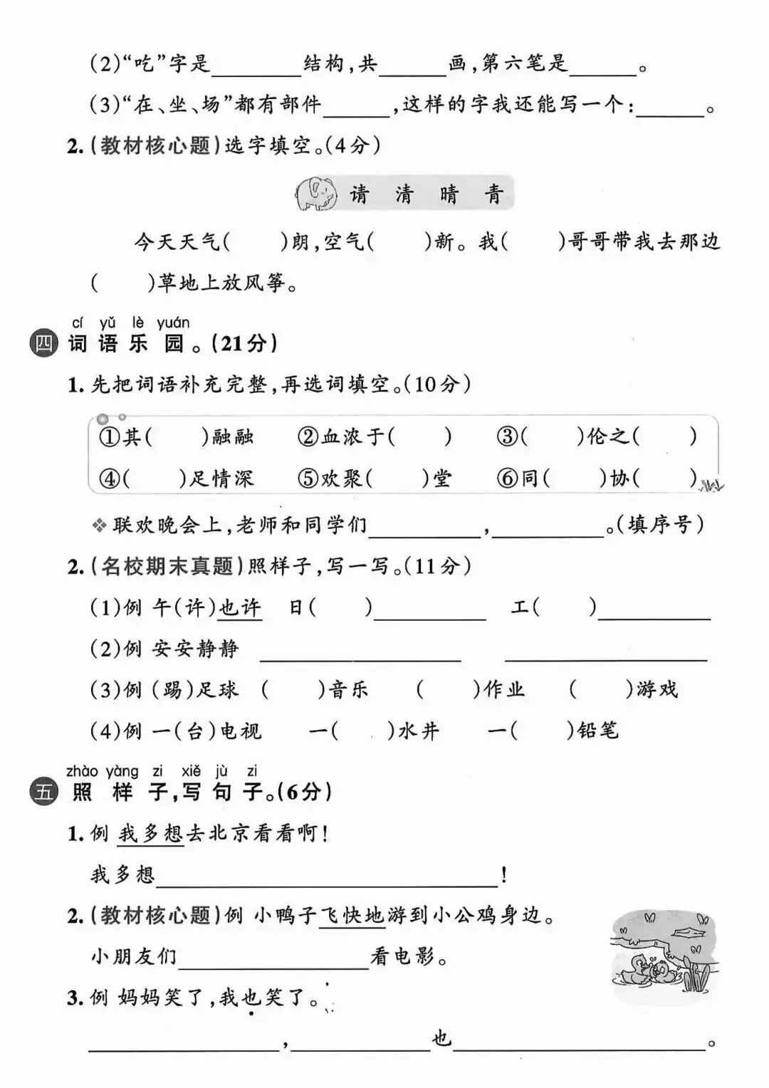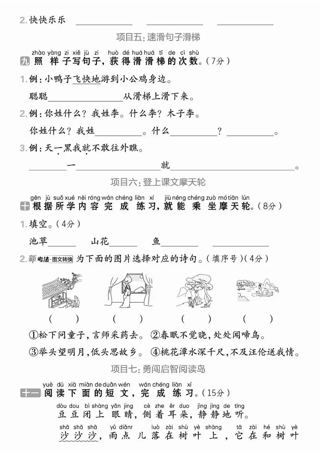 在字词基础上,增加句子仿写、连词成句、简单阅读理解,侧重课文内容填空、标点符号运用,贴合课内重点句式训练,难度适中,适合巩固课内知识、查漏补缺薄弱环节。