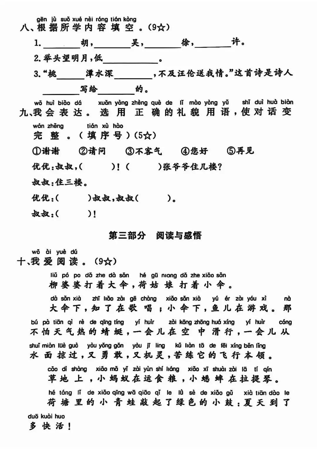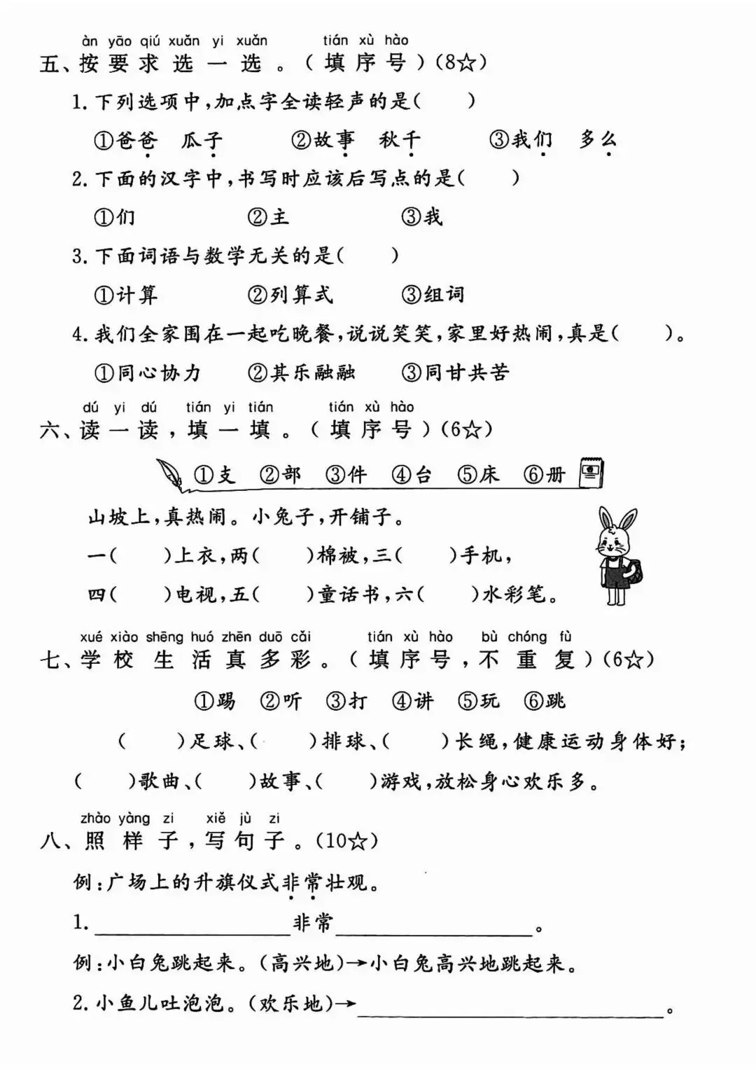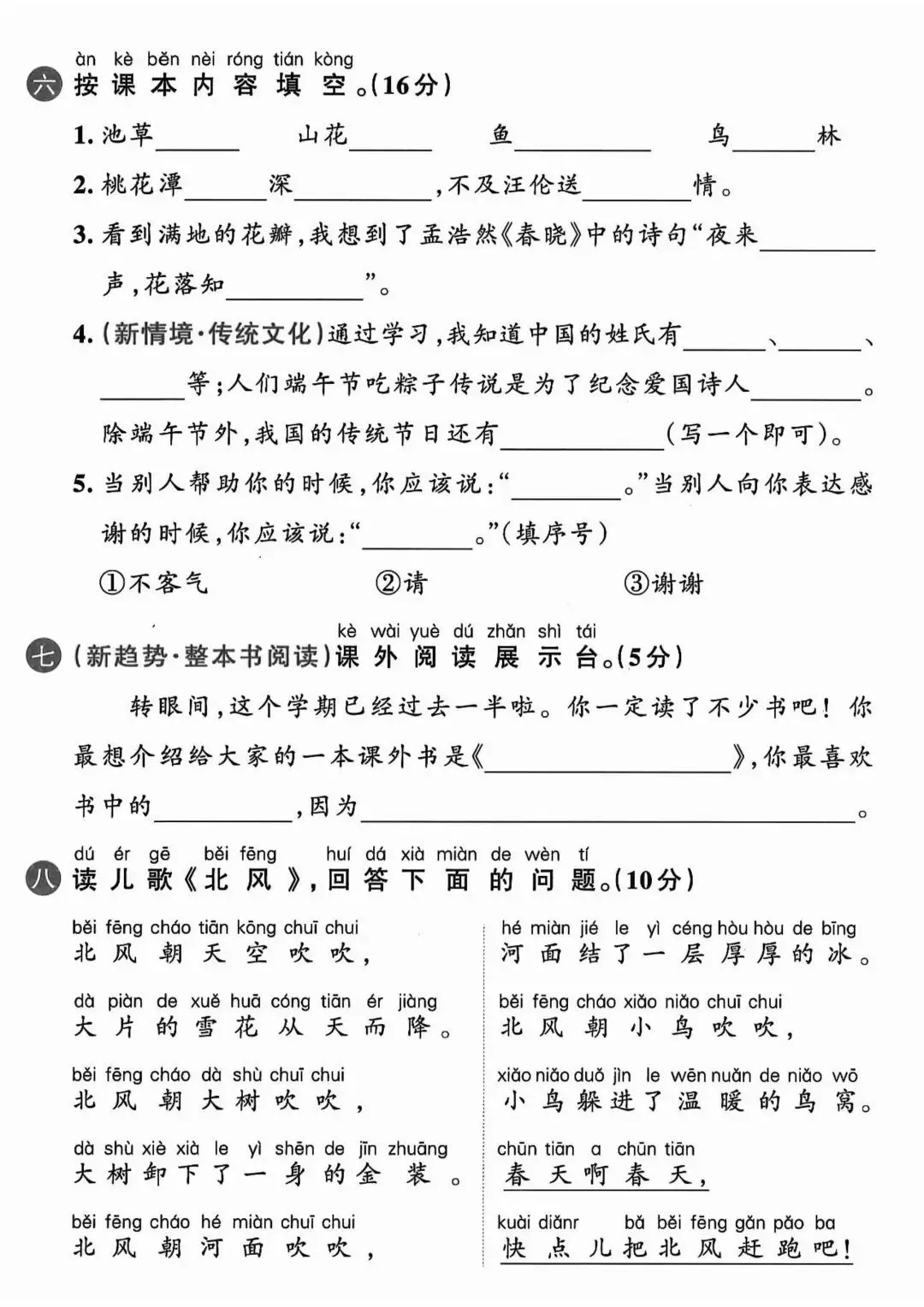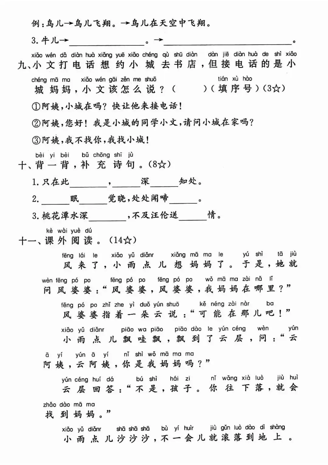 在字词基础上,增加句子仿写、连词成句、简单阅读理解,侧重课文内容填空、标点符号运用,贴合课内重点句式训练,难度适中,适合巩固课内知识、查漏补缺薄弱环节。