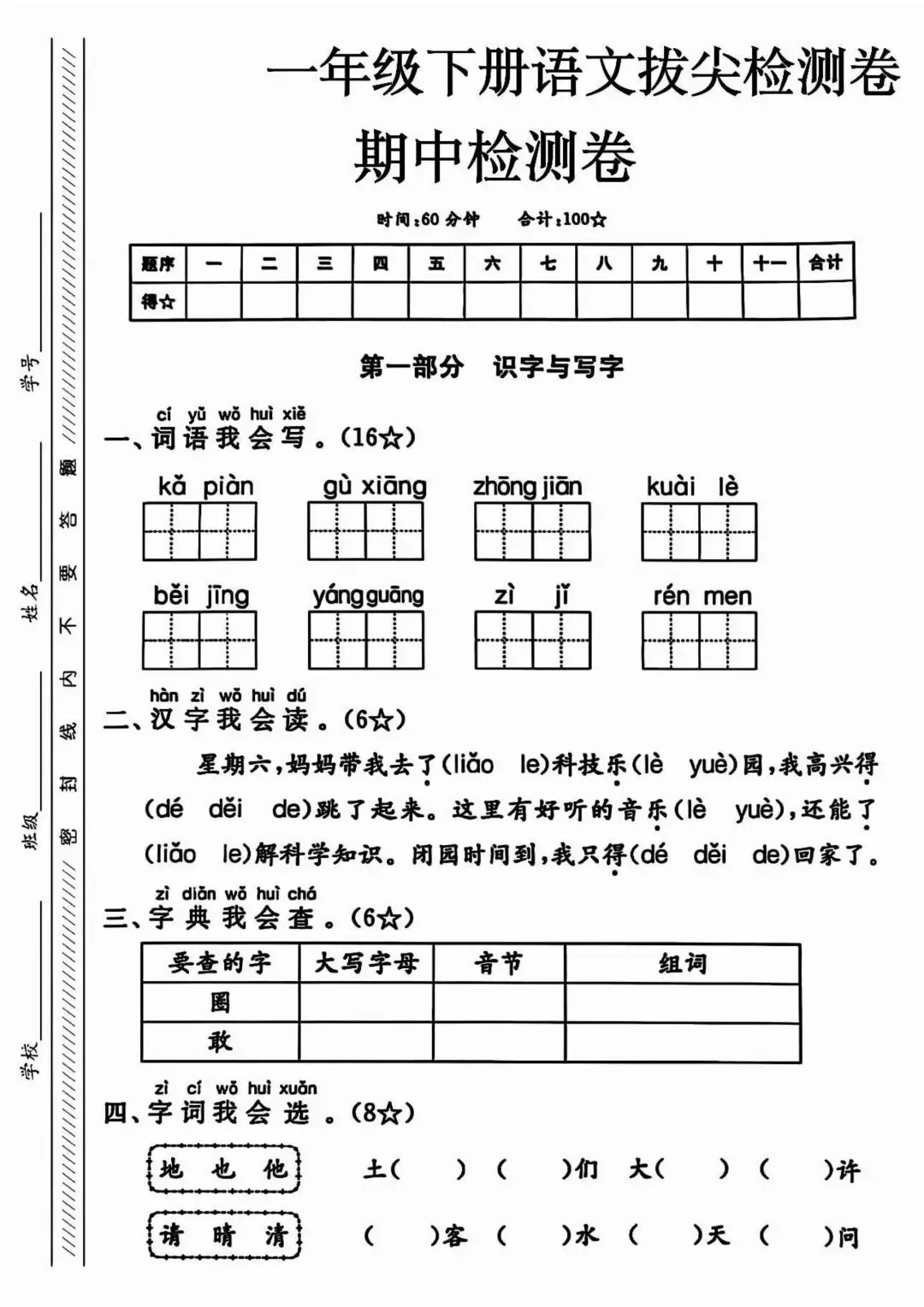 《一下语文期中拔尖检测卷1》