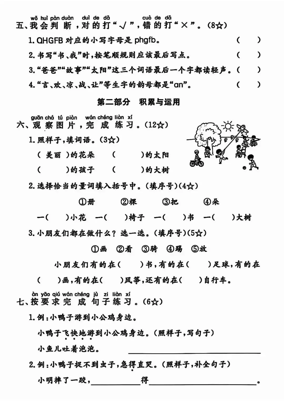 侧重语文思维与灵活运用,增加多音字辨析、词语归类、阅读理解深度考查、看图写话细节描写,适度加入易错点、易混点、拓展题,适合基础扎实、想冲刺高分的孩子练习。