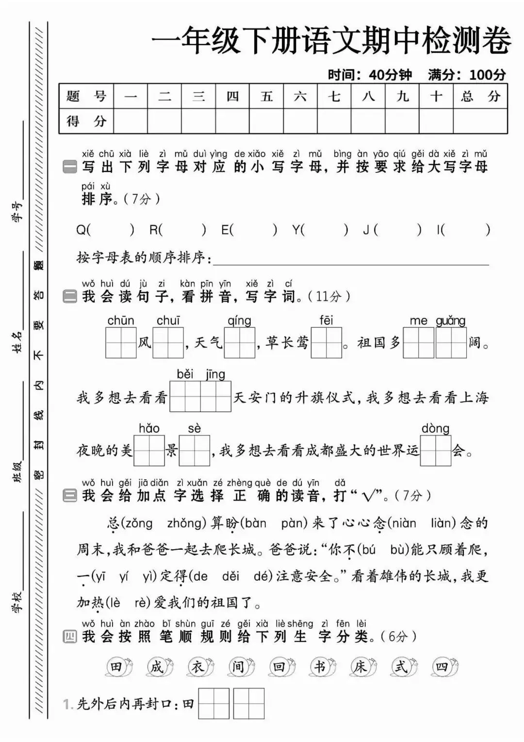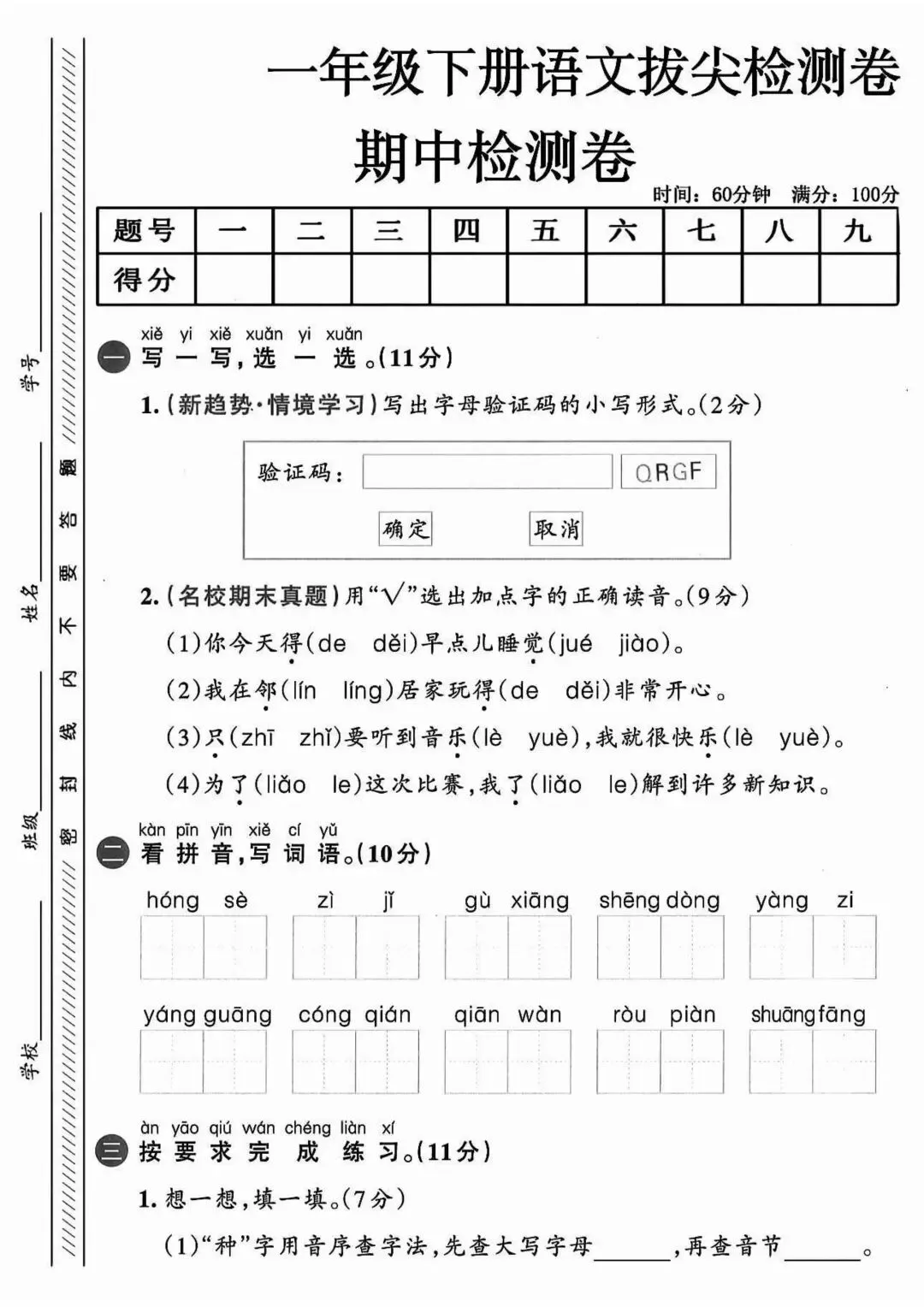一年级下册语文期中测试卷可打印|涵盖期中全考点,这5套押题卷搞定考前冲刺