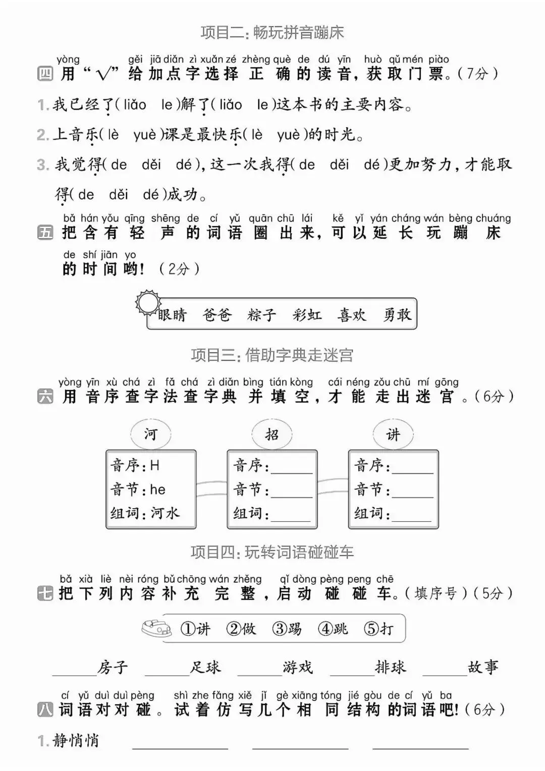 以生字、词语、拼音为核心,重点考查字音字形、偏旁部首、近义词反义词、简单词语搭配,题型以看拼音写词语、形近字组词、选词填空为主,难度低、题量适中,适合夯实字词基础、快速巩固课内必考点。