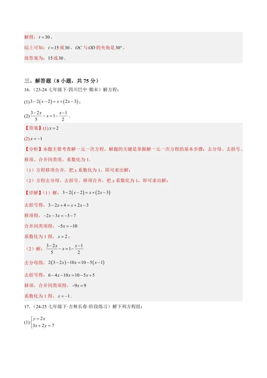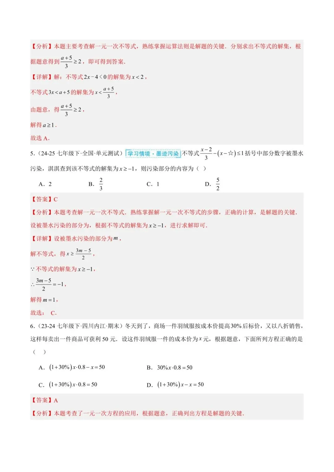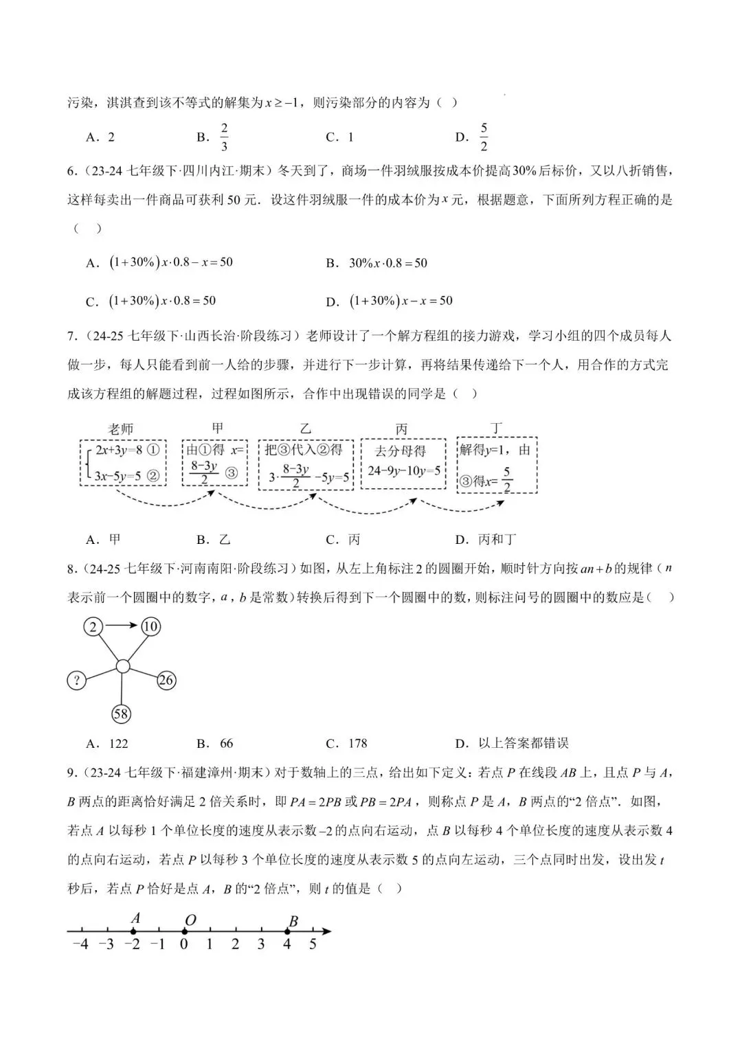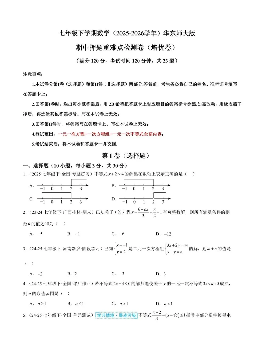 七年级下册师大版《数学期中测试卷》|完整电子版可打印