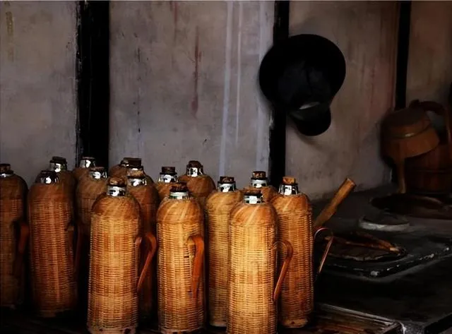 热水瓶一字排开,壳儿是竹子编的,胆是玻璃的,以前夏天打水冬天装热汤都靠它,外壳裂一缝就用麻皮绑紧,妈妈装满热水说:“别乱碰烫手”,提着走亲访友必备家伙,现在塑料保温杯多彩又轻巧,老竹壳的在角落里慢慢落了灰。