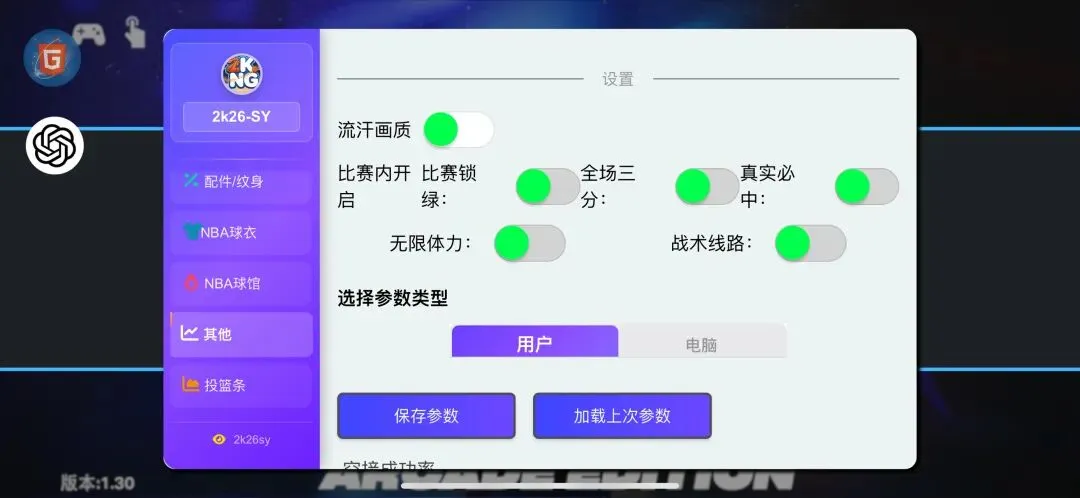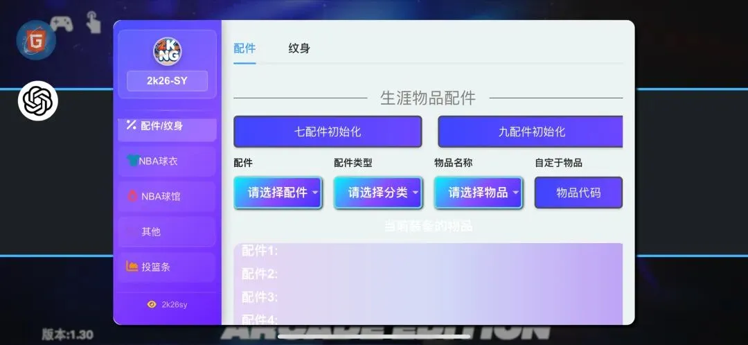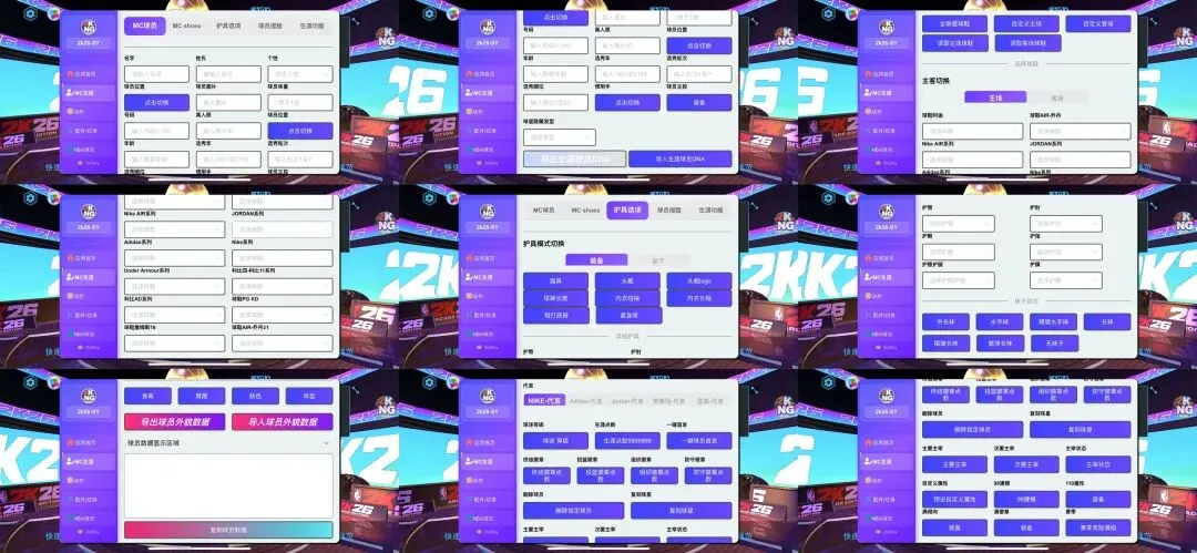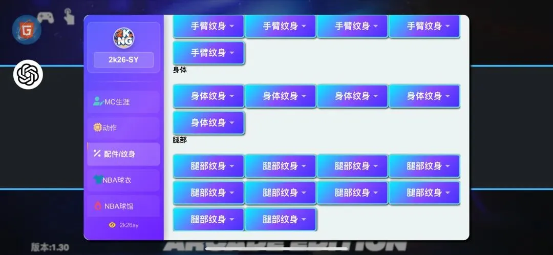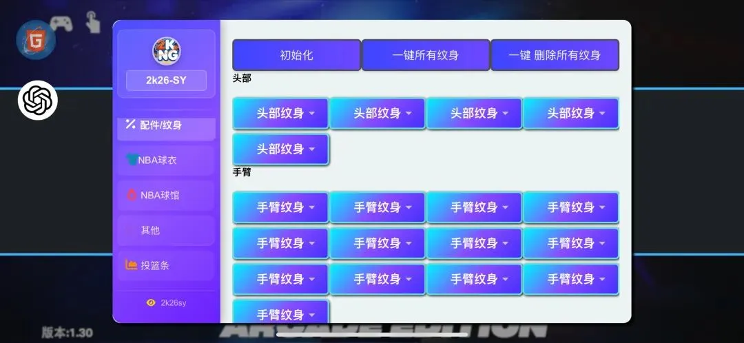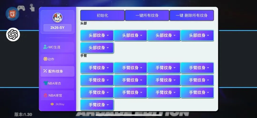 游戏内所有的球衣 包括复古球衣地板等 生涯模式可以修改隐藏配件 比如耳机 毛巾 眼镜 特殊衣服等 还有街头模式的耳机配件等隐藏护具 主要是生涯可以自定义纹身 多种纹身任你选 全模式有流汗画质 增强游戏体验 功能请看图