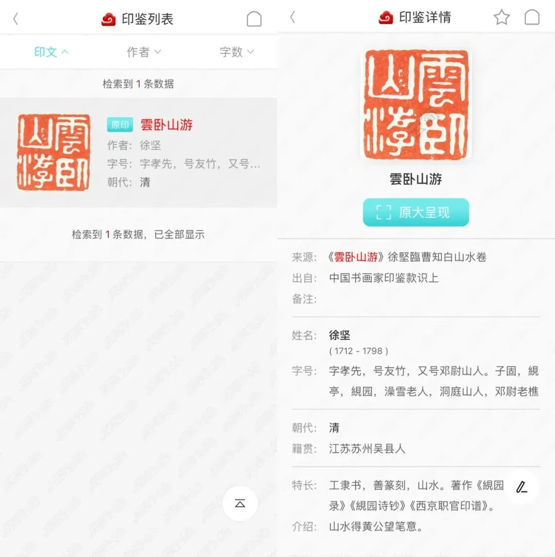 这是它最受欢迎的功能。你输入画家名字、印章字数或者形状,它就能快速匹配出对应的印鉴,还能原大小对比。对于判断作品真伪、了解流传经过很有帮助。基本上历代重要书画家的常用印章都覆盖了。不过部分深度查询需要会员。