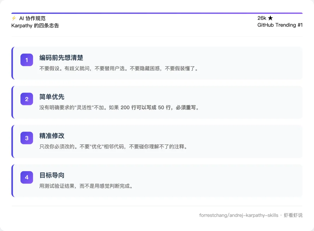 forrestchang/andrej-karpathy-skills 这个项目,就是针对这三个场景设计的”AI 协作规范”。文件很短,只有四条原则,每条都直接对应一个真实痛点: