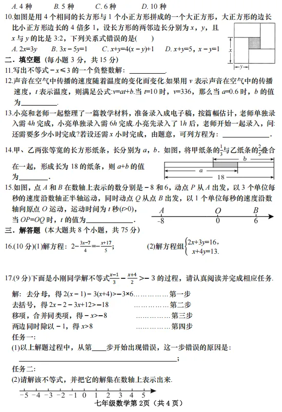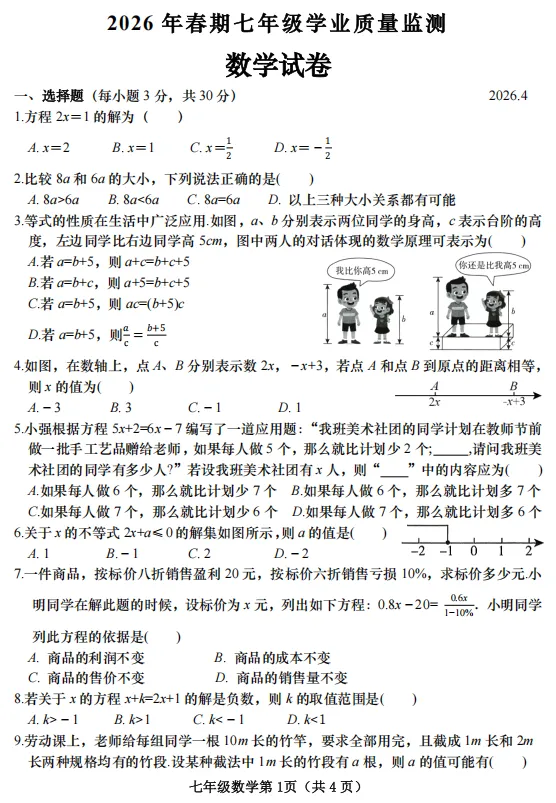 2026年春期七年级数学期中试卷+答案+答题卡(word+PDF)