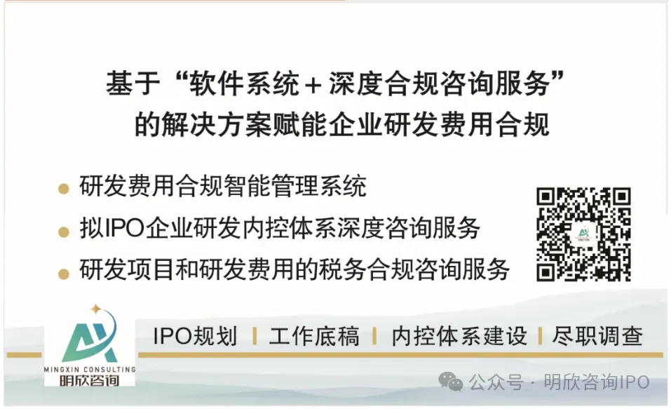 自成立以来,明欣咨询秉持“客户至上、契约为本、团队协作、乐观进取、认知迭代、坦诚沟通”的服务理念,以卓越的服务品质与专业的服务态度,赢得市场广泛赞誉。迄今,团队已为超100家境内外拟上市及已上市公司提供高质量的IPO咨询服务,涵盖市前规划、内控体系咨询、研发深度咨询、研发管理系统搭建、投融资尽调、税务合规等全方位服务,更开创性地成为业内首家提供“IPO研发合规咨询+研发管理软件”整体解决方案的服务商公司IPO研发合规咨询服务及研发费用智能管理系统为解决企业研发项目及研发费用管理合规化难题而生,深度融合IPO上市、高新技术企业认定、研发费用加计扣除三大核心需求,为企业实现一站式解决方案。