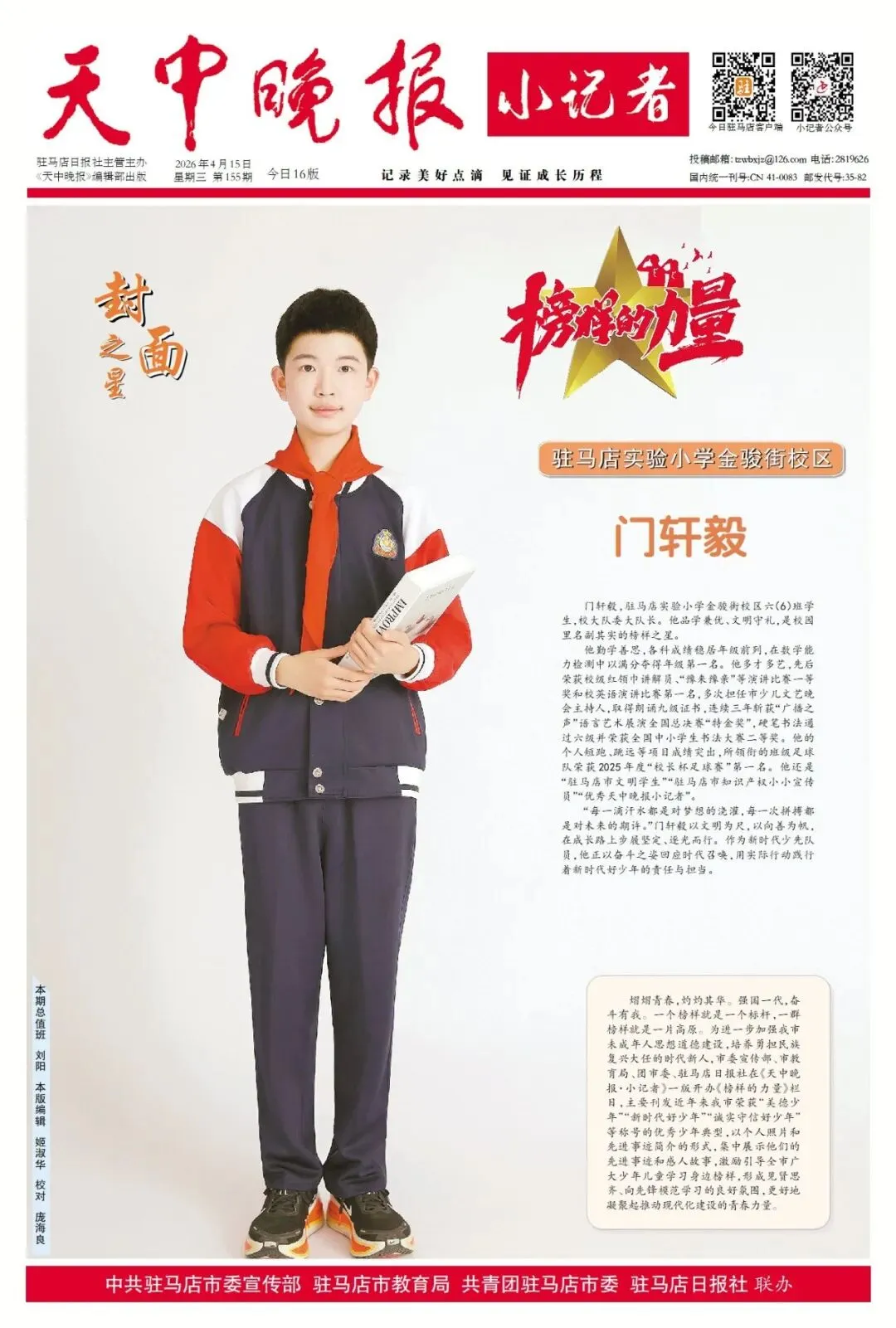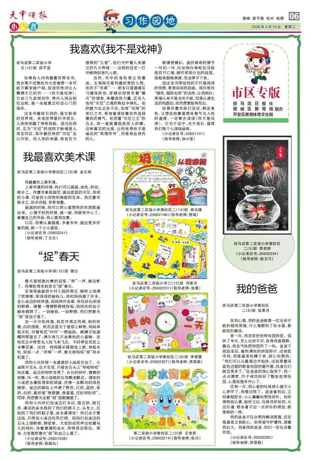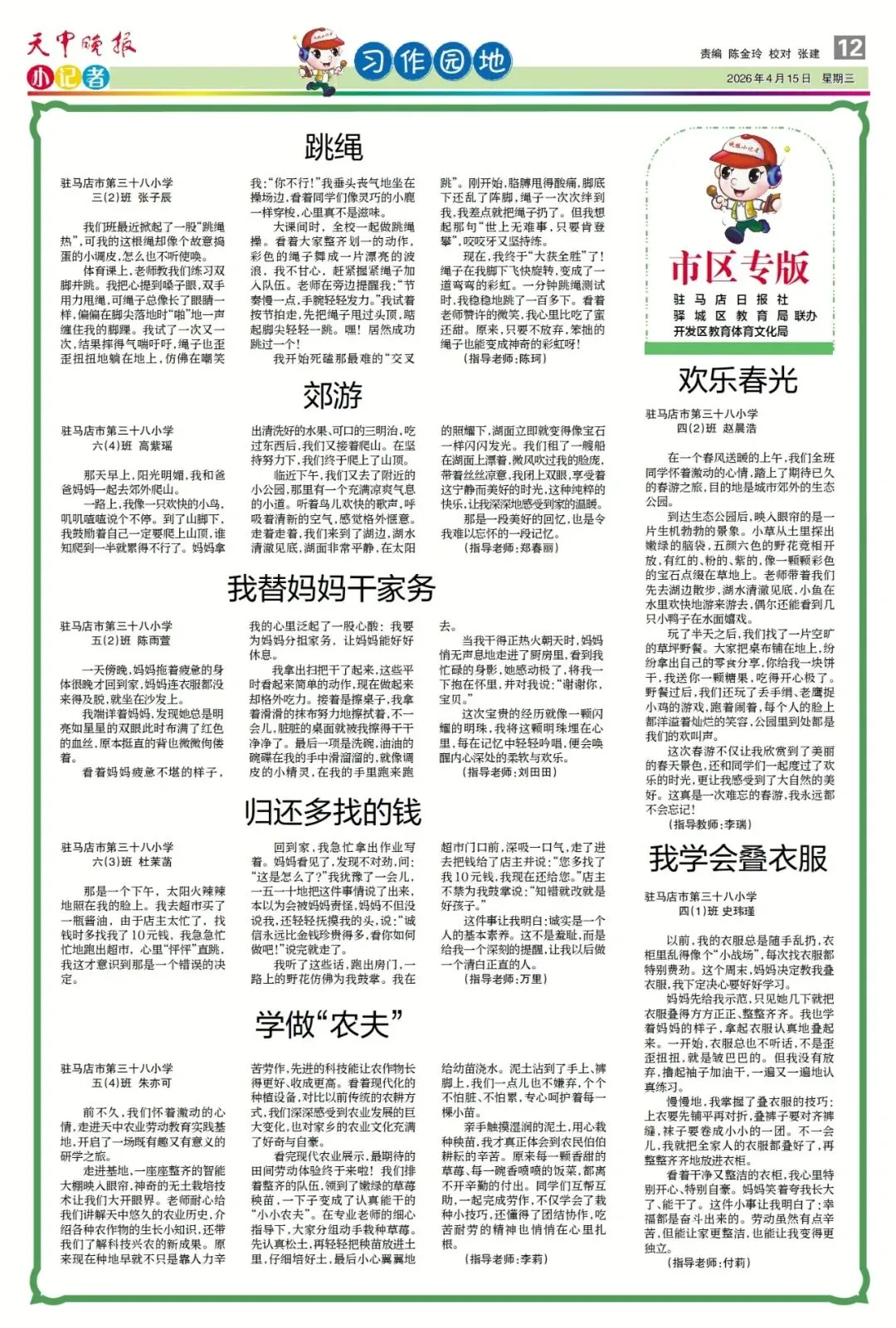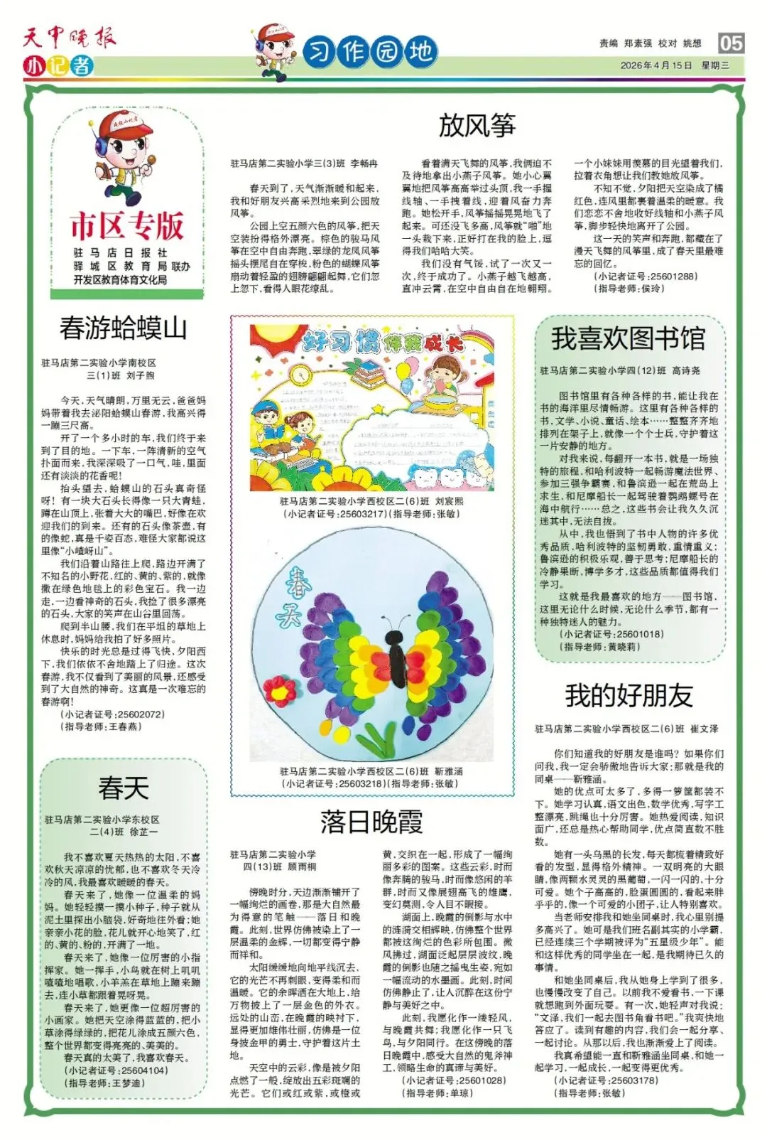 【点赞收藏】最新一期 天中晚报小记者报电子版全览 点击关注 查看更多小记者活动↓↓↓ 《天中晚报·小记者》 2026年4月15日电子版 01 封面 02 校园新闻 03 习作园地 13 成长路上 编辑 |尹媛媛 审核 | 刘阳 终审 | 李会 你点的每个赞,我都认真当成了喜欢