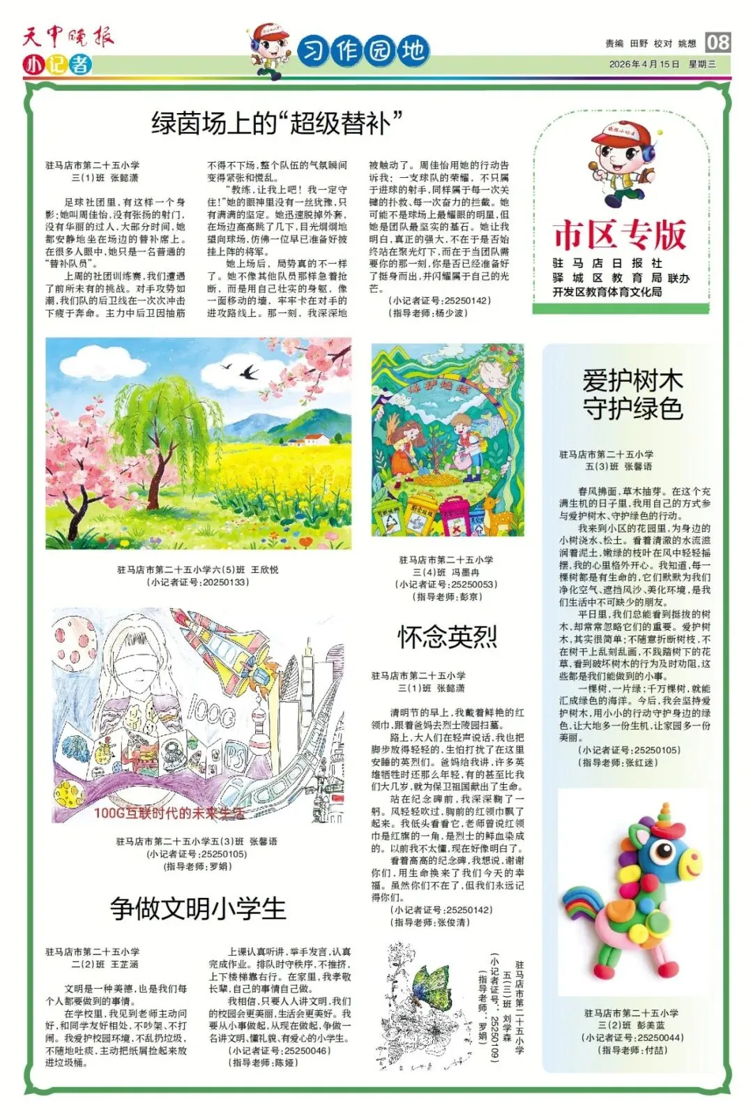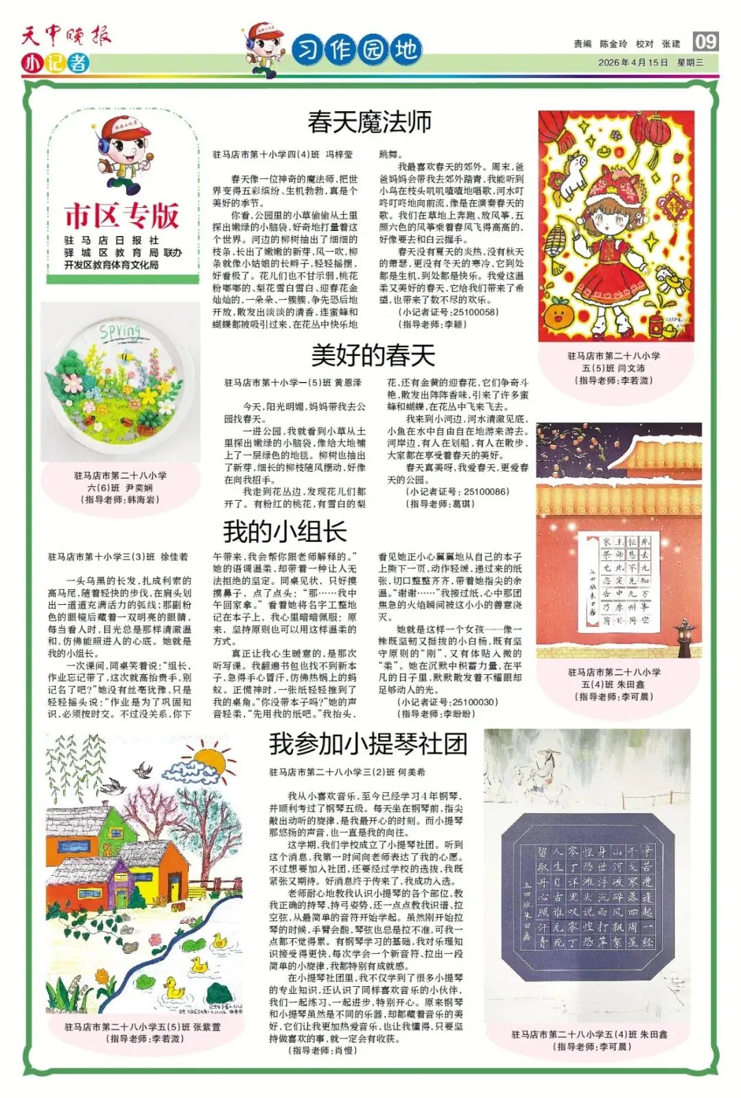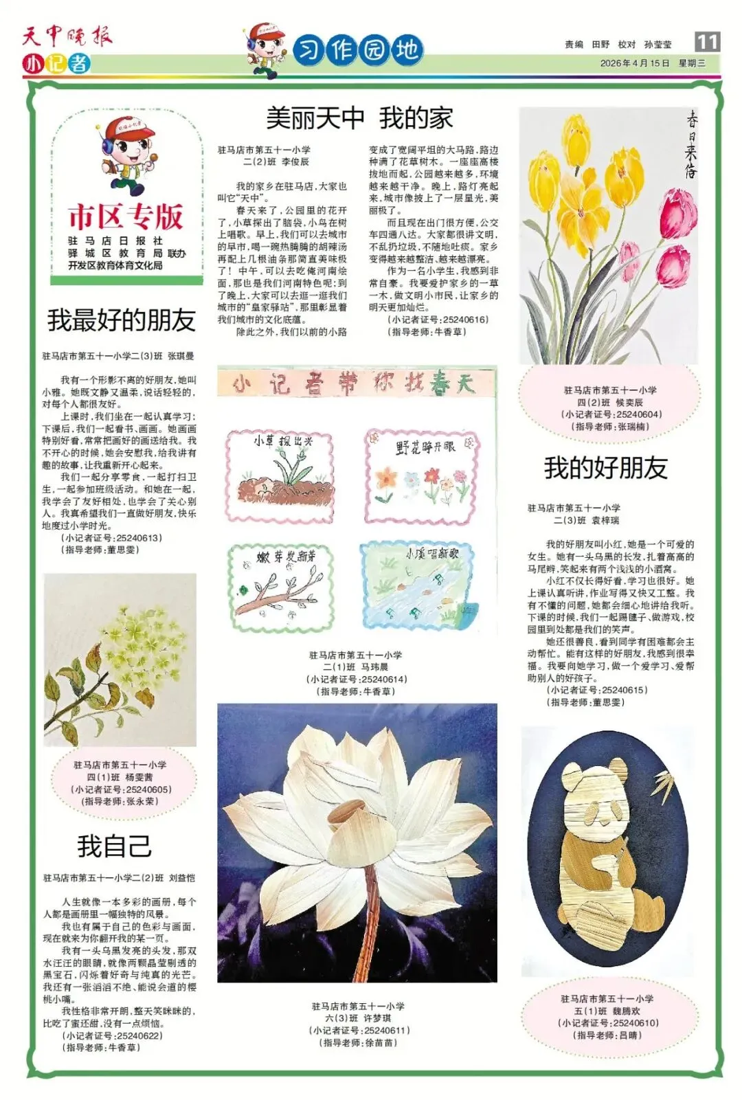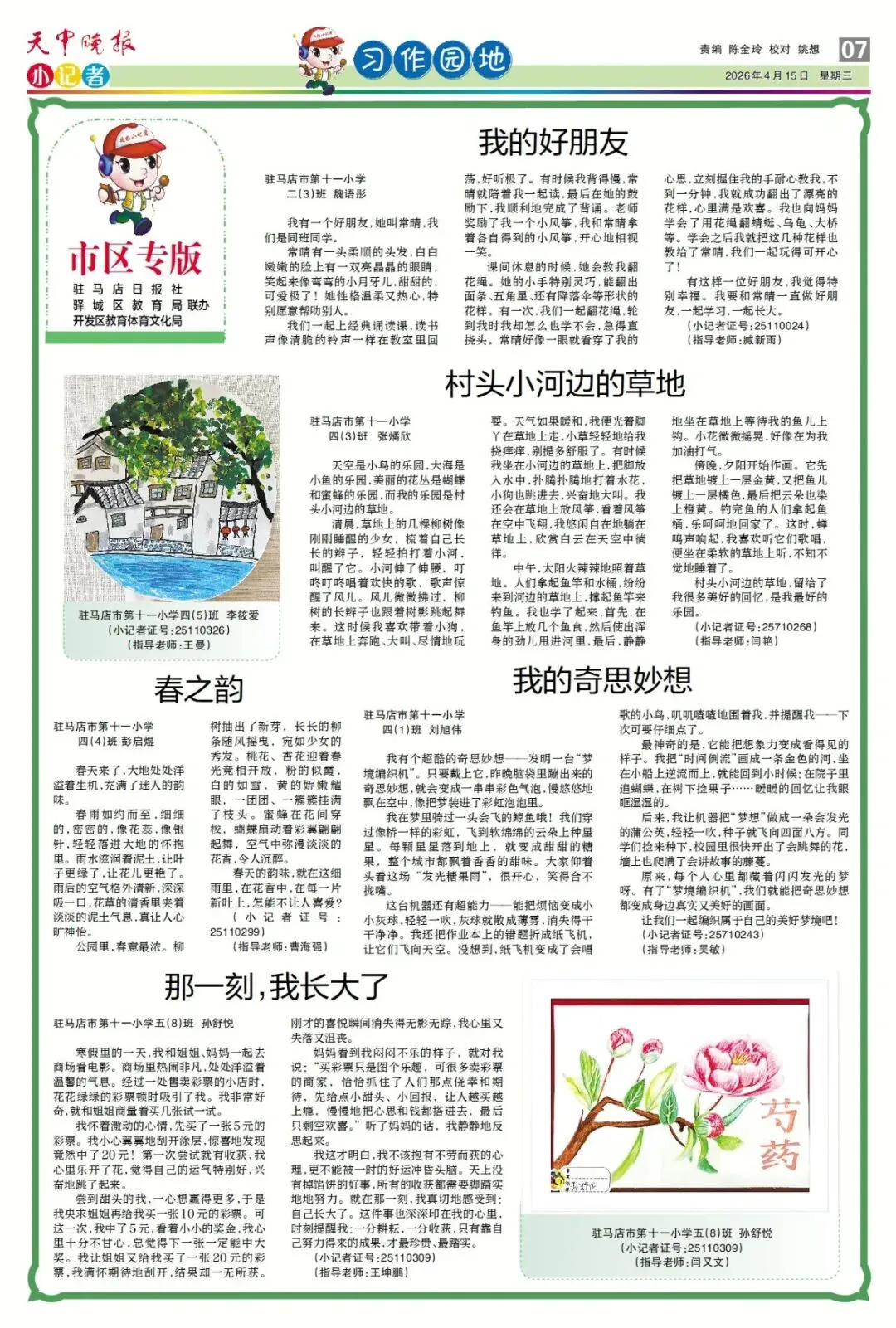 【点赞收藏】最新一期 天中晚报小记者报电子版全览 点击关注 查看更多小记者活动↓↓↓ 《天中晚报·小记者》 2026年4月15日电子版 01 封面 02 校园新闻 03 习作园地 13 成长路上 编辑 |尹媛媛 审核 | 刘阳 终审 | 李会 你点的每个赞,我都认真当成了喜欢