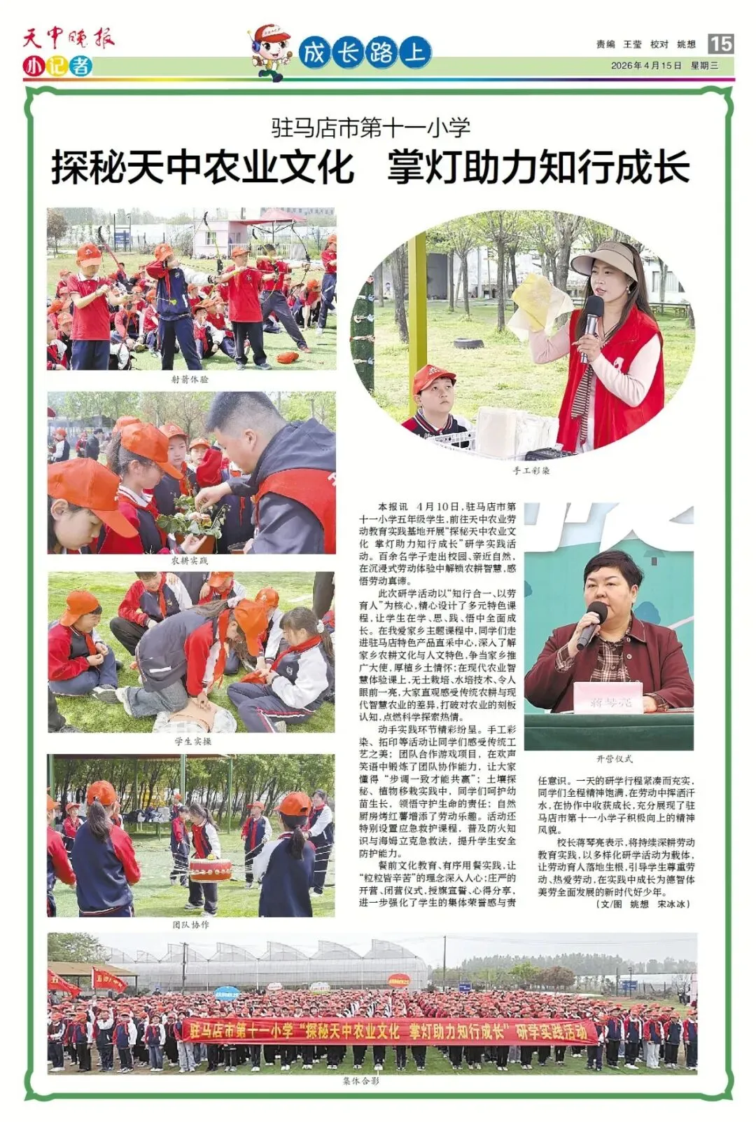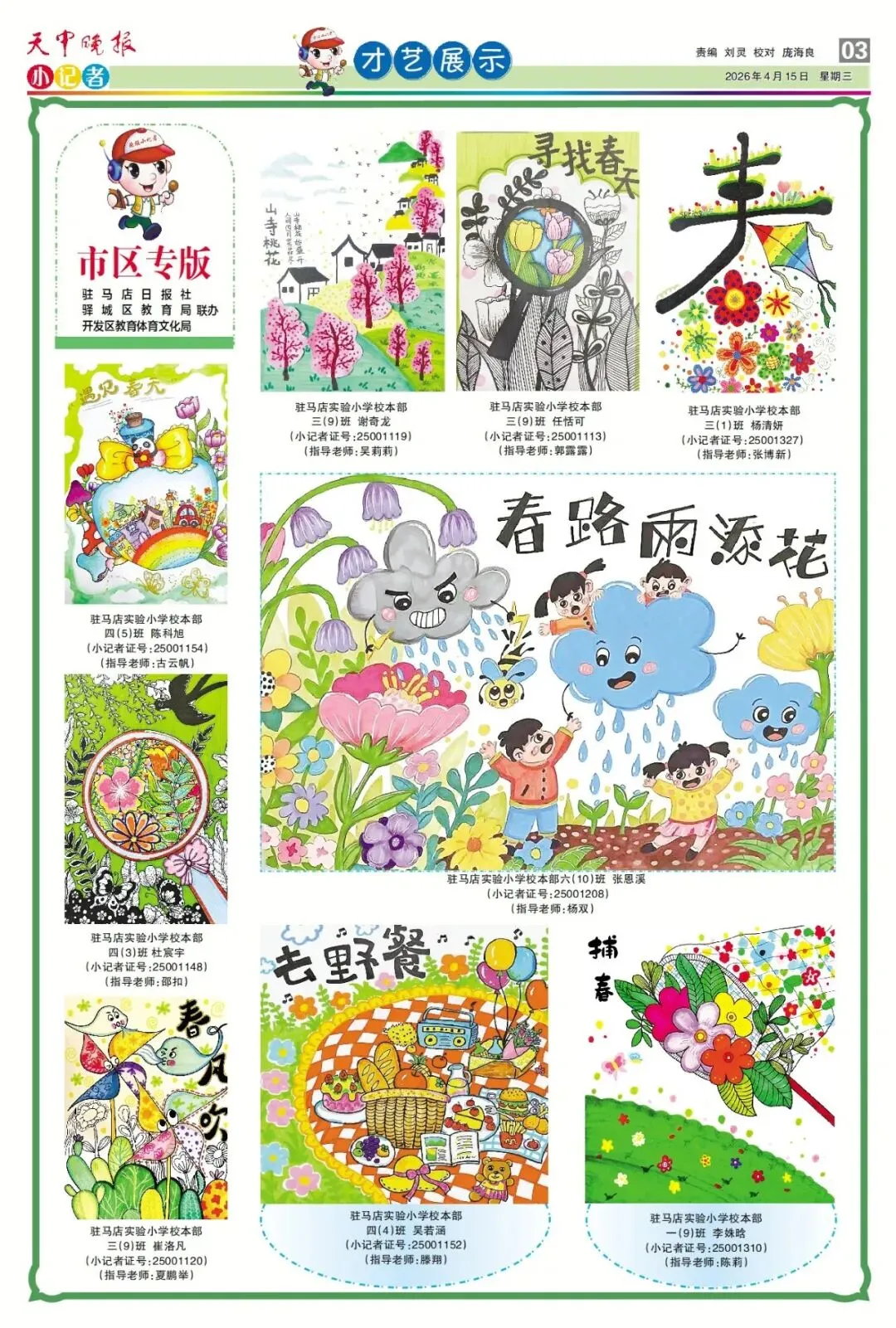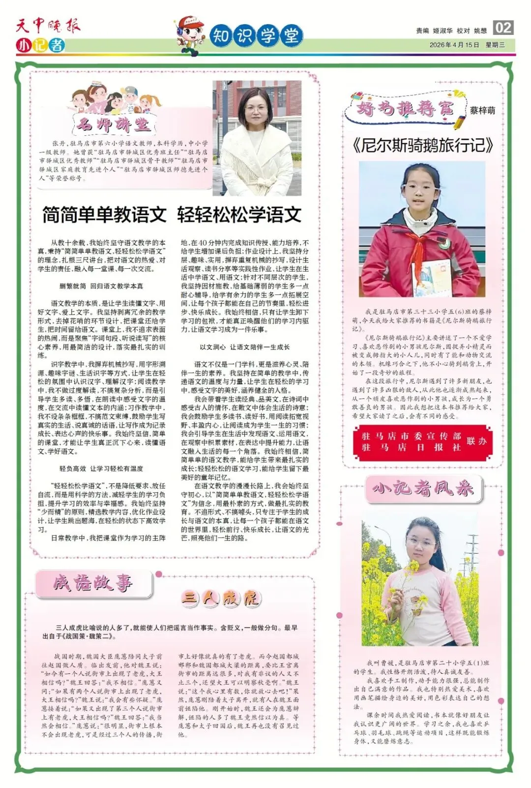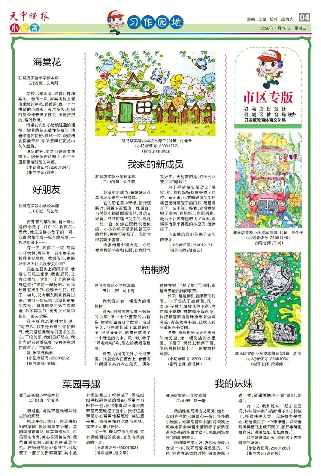 【点赞收藏】最新一期 天中晚报小记者报电子版全览 点击关注 查看更多小记者活动↓↓↓ 《天中晚报·小记者》 2026年4月15日电子版 01 封面 02 校园新闻 03 习作园地 13 成长路上 编辑 |尹媛媛 审核 | 刘阳 终审 | 李会 你点的每个赞,我都认真当成了喜欢