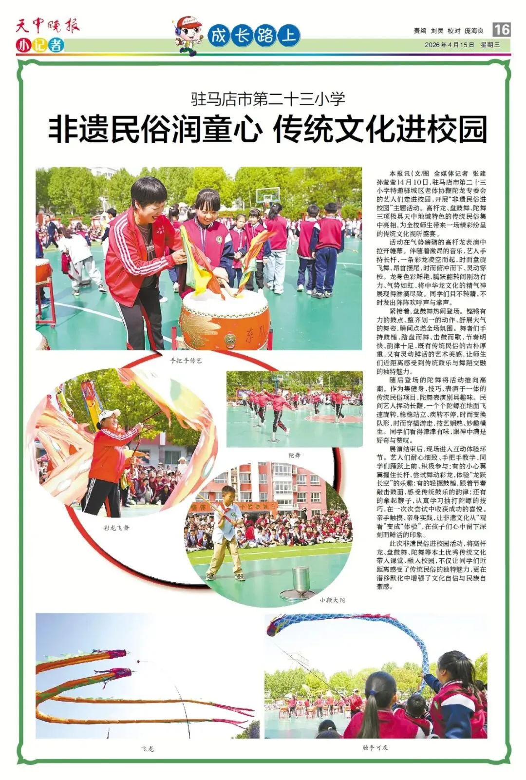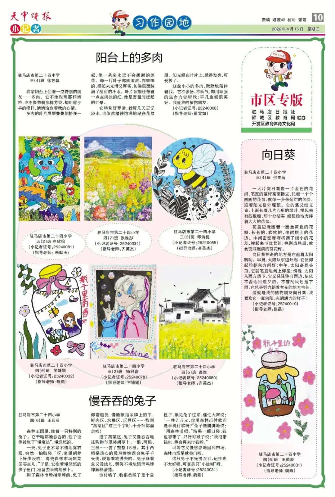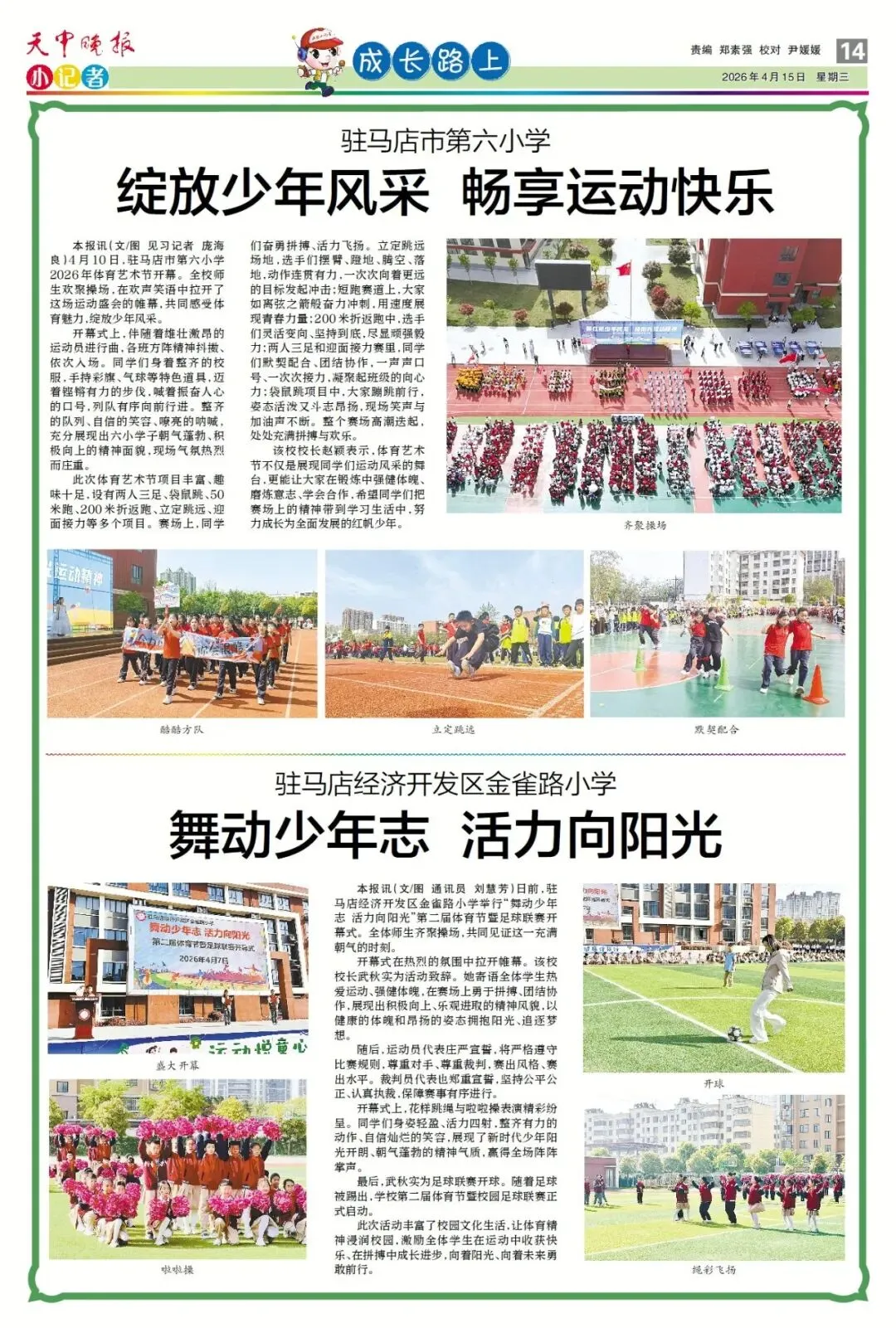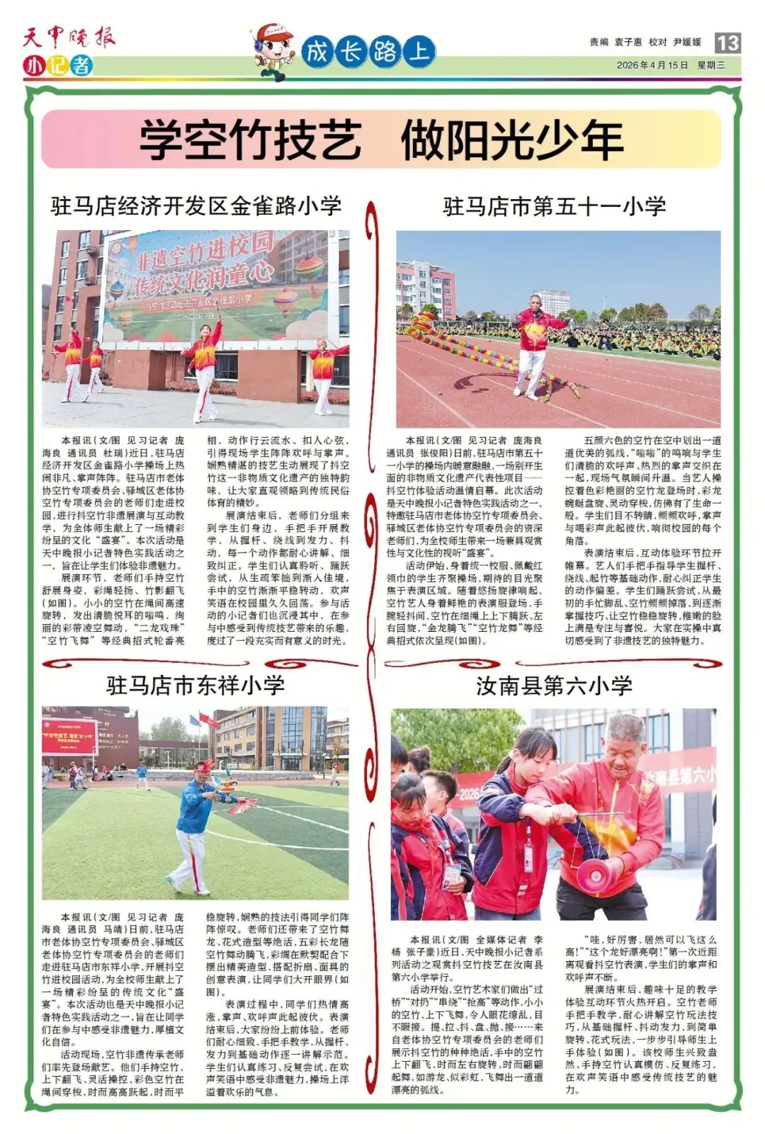 【点赞收藏】最新一期 天中晚报小记者报电子版全览 点击关注 查看更多小记者活动↓↓↓ 《天中晚报·小记者》 2026年4月15日电子版 01 封面 02 校园新闻 03 习作园地 13 成长路上 编辑 |尹媛媛 审核 | 刘阳 终审 | 李会 你点的每个赞,我都认真当成了喜欢