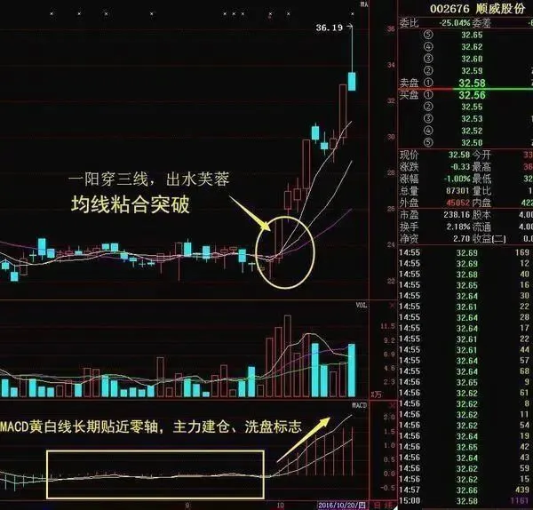 (1)当股价长期在季均线之下滑跌,有一天突然放量冲过季均线并能收盘在季均线之上,这一根阳线称为出水芙蓉。