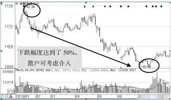 一般而言,一只主力股一旦从高位回落,跌幅超过50%的价位,将会遇到强大的支撑,有望出现一波反弹行情,散户此时介入风险较低,获利的机会也比较大。