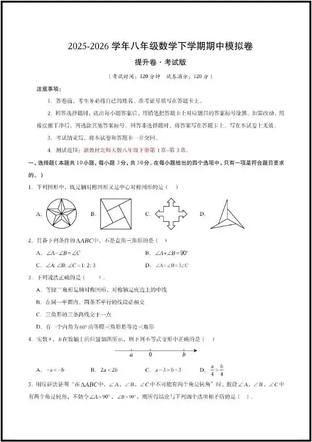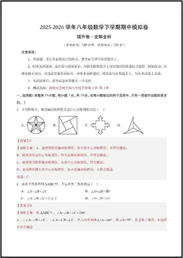 (2026北师大版)初二八下数学:期中模拟卷最新7套(含答案解析)完整电子版可打印!