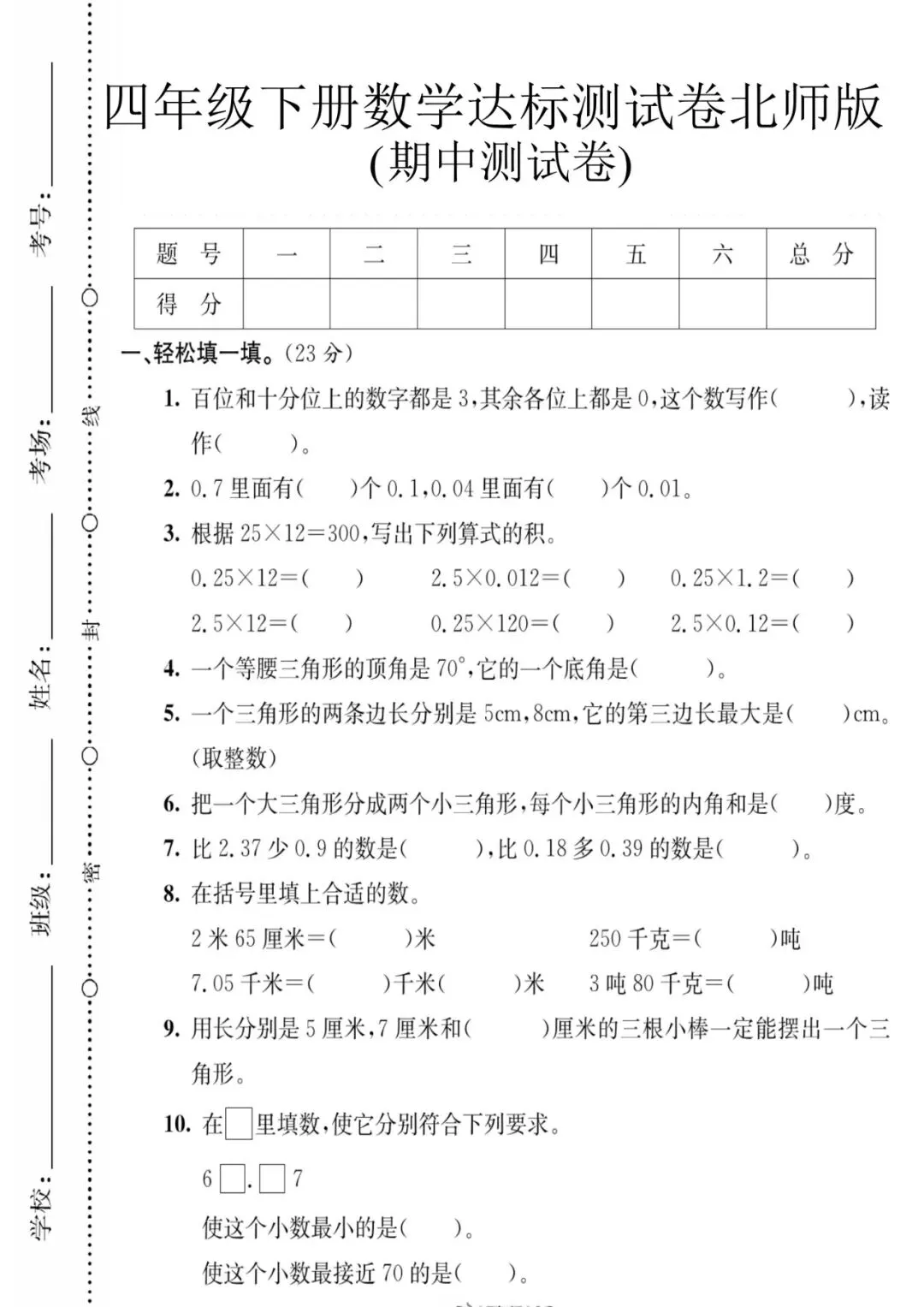 2026春四年级下册北师大版数学《期中检测试卷 | 模拟卷》(含答案 共7套) ,可下载打印