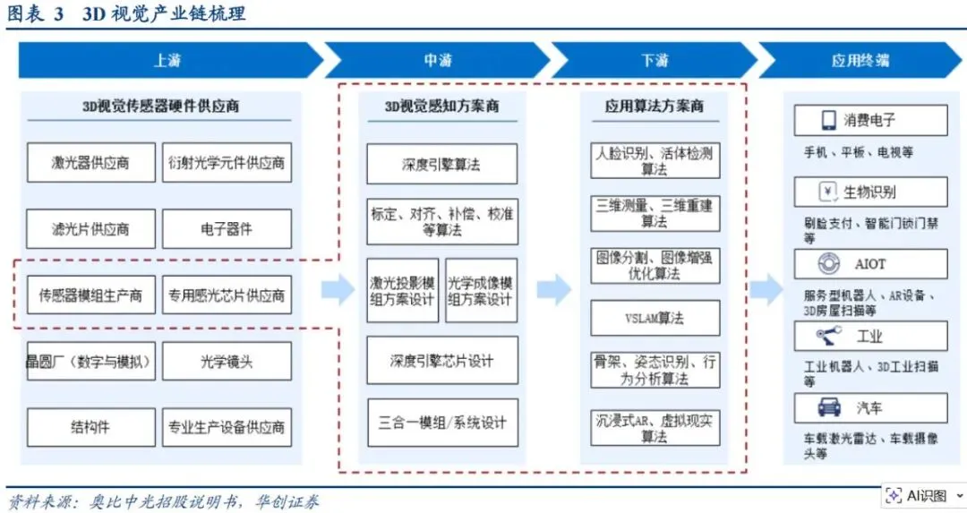 上游主要包括CMOS传感器、激光器、VCSEL、镜头、滤光片、DOE、处理芯片、存储、电源管理和结构件等。这一层级决定了视觉系统的光学成像质量、深度感知能力、功耗水平和系统可靠性。长期来看,高端传感器与关键光学部件仍是行业中技术壁垒较高的环节。