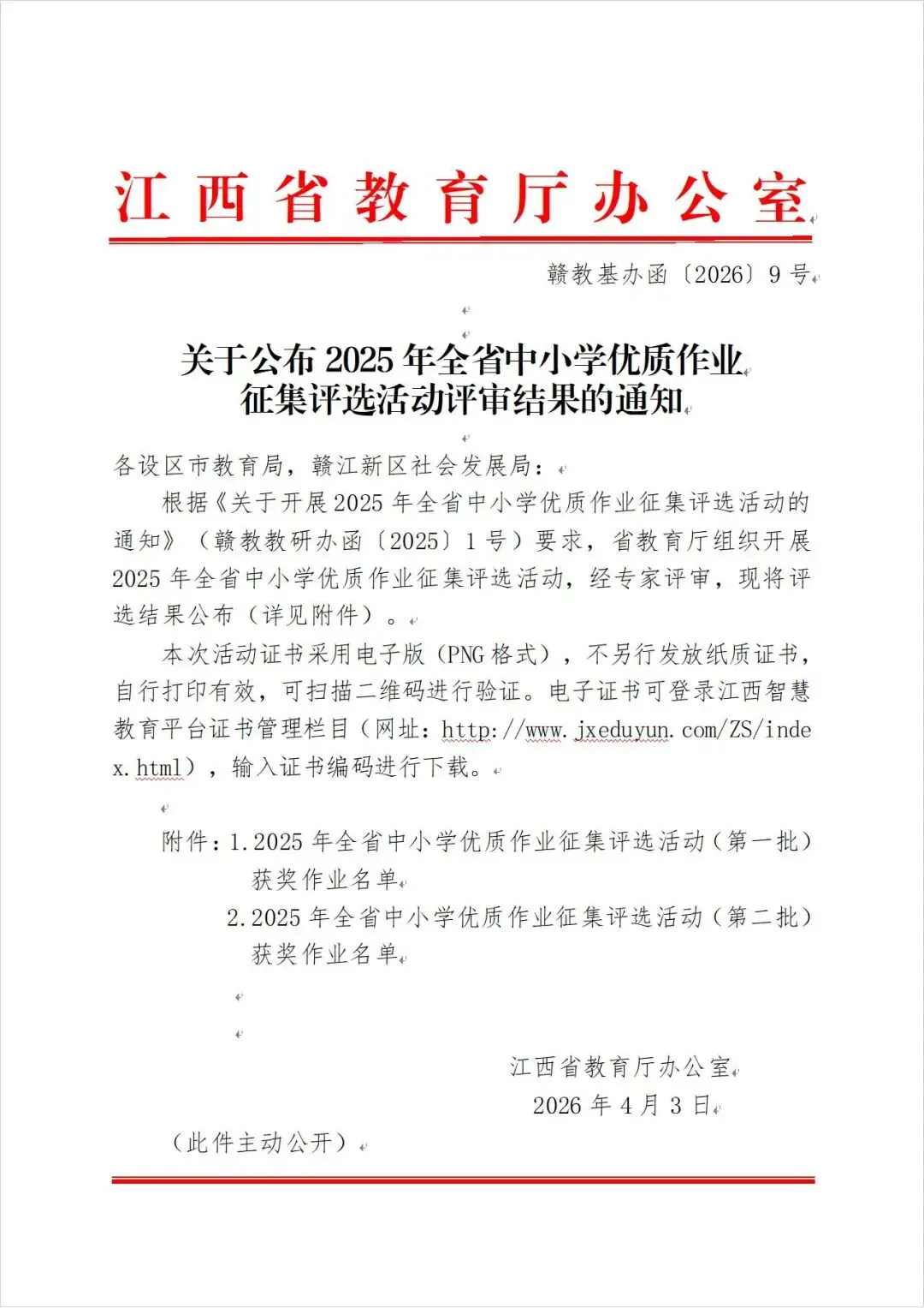 文件有点长,识别二维码,打开“赣教基办函〔2026〕9号关于公布2025年全省中小学优质作业征集评选活动评审结果的通知.pdf”搜索名字,找到证书编号,点击阅读进入官网(网址: http://www.jxeduyun.com/ZS/index.html)下载。