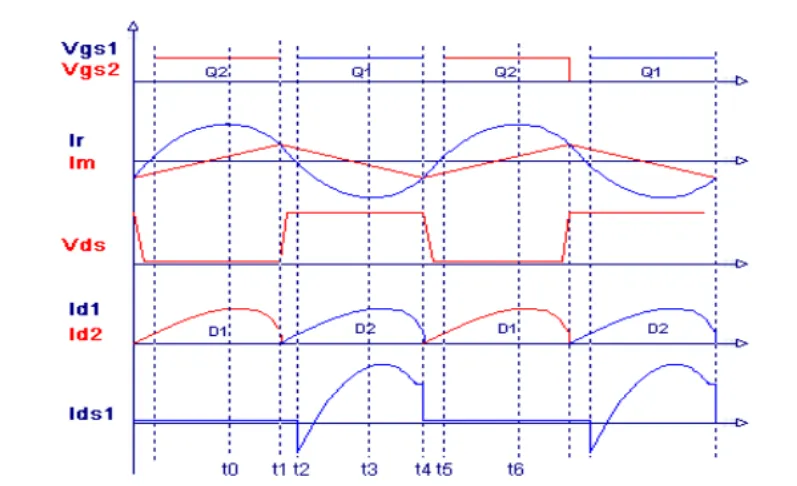 LLC电路的工作循环根据开关状态和能量流动可细分为6个阶段。以下以典型工作波形(图2-2)为参考进行分析: