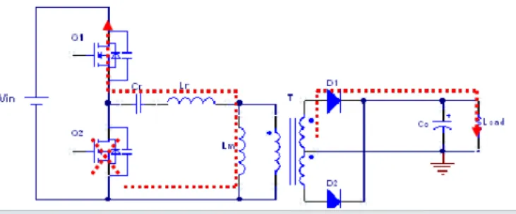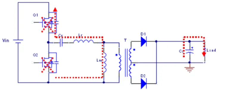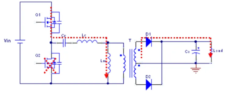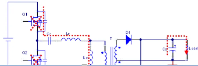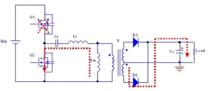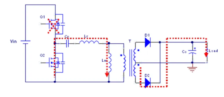 谐振电流 由负变正,Q1正式流过正向电流。谐振电流从输入端流向地。在此阶段, 和 继续谐振,能量持续通过D1传输至负载。