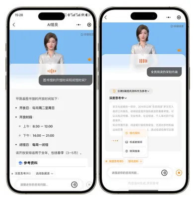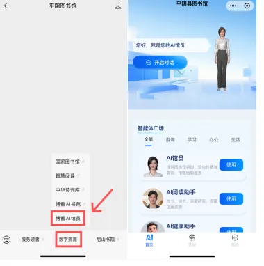 关注“平阴图书馆”公众号,点击底部菜单“数字资源–博看AI馆员”进入体验。