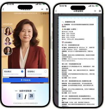 通过28个细致问题,了解用户的性格、兴趣及职业方向等信息,生成专属“职业画像”。结合最新行业趋势,给出择业建议与长期发展规划。